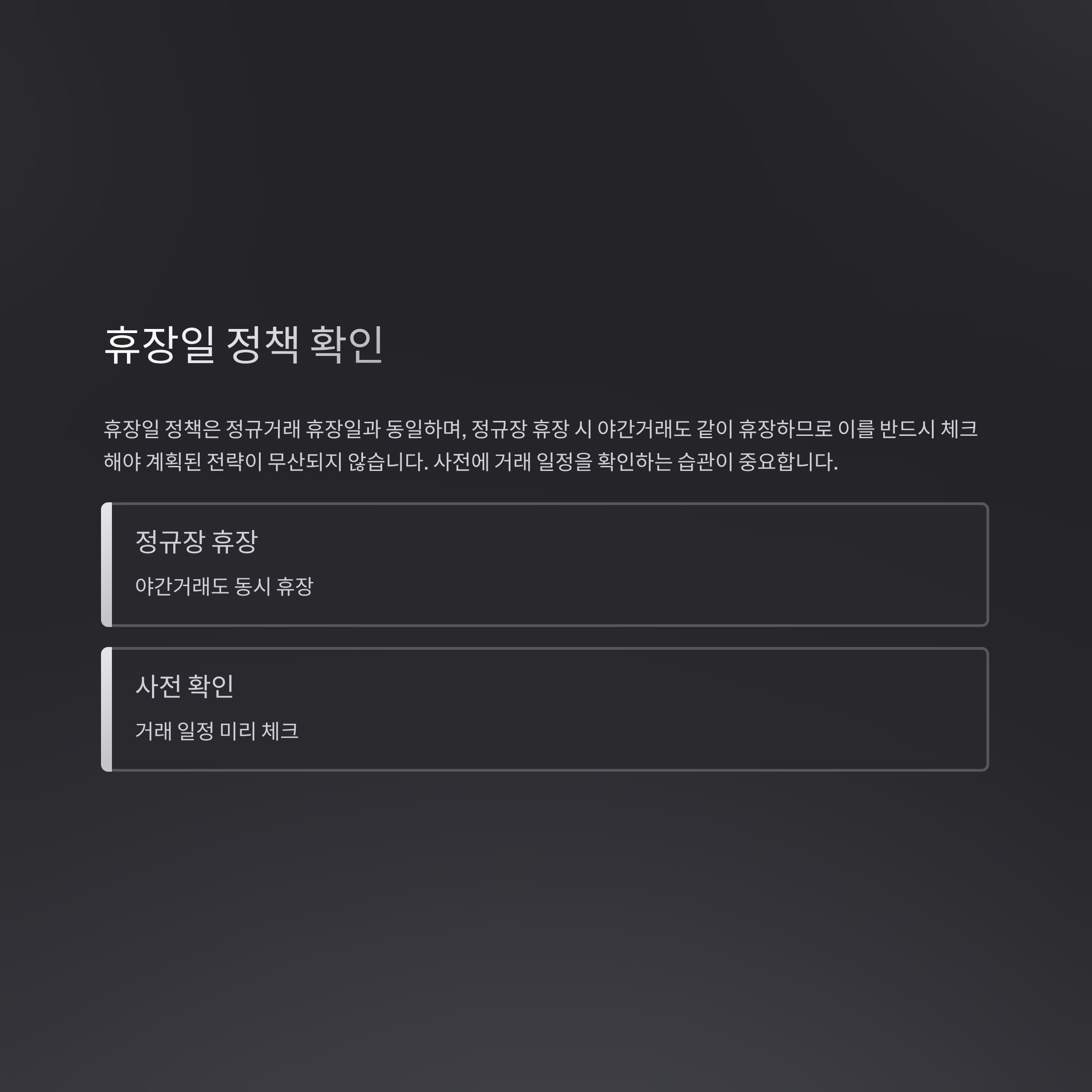 - 휴장일 정책은 정규거래 휴장일과 동일하며, 정규장 휴장 시 야간거래도 같이 휴장하므로 이를 반드시 체크해야 계획된 전략이 무산되지 않습니다.