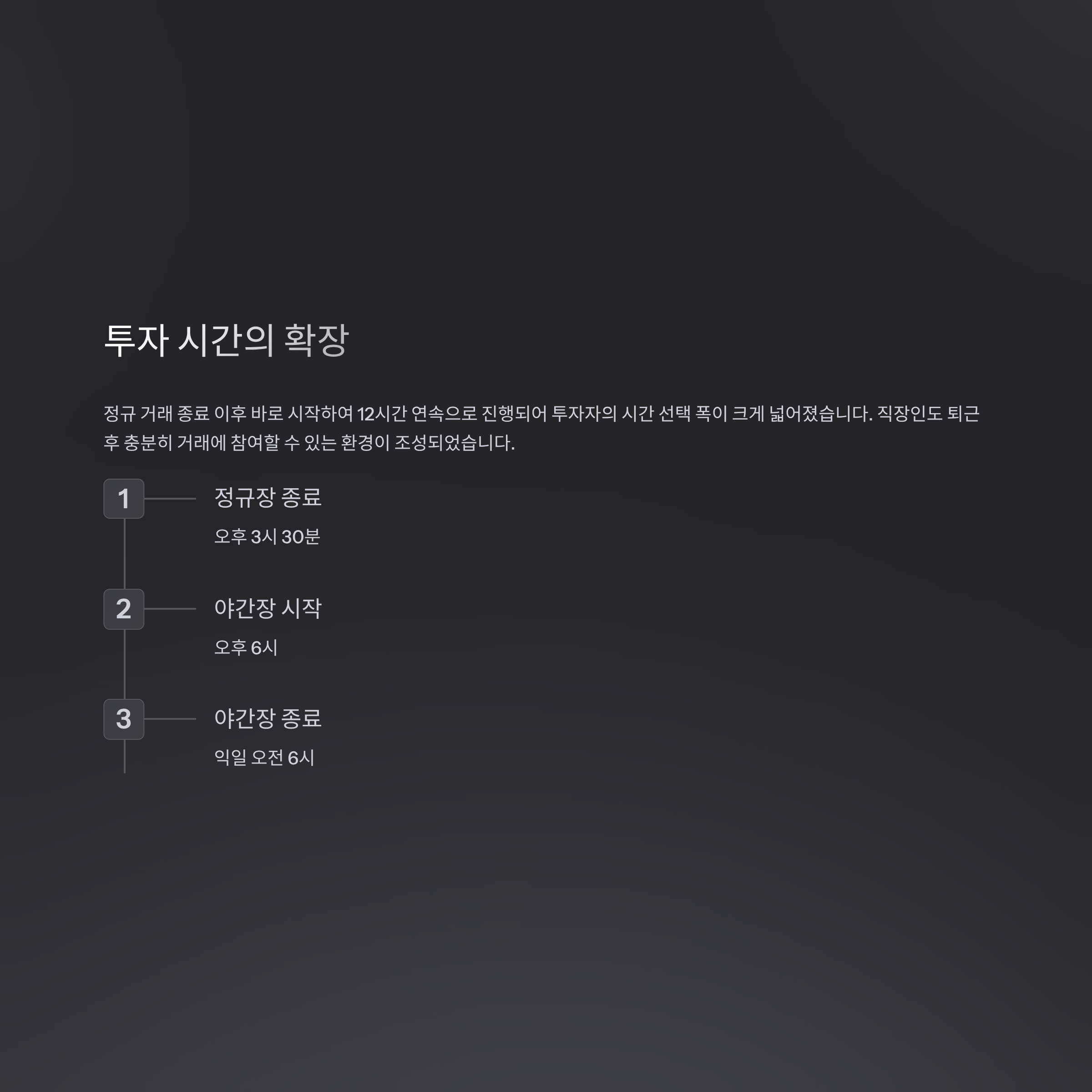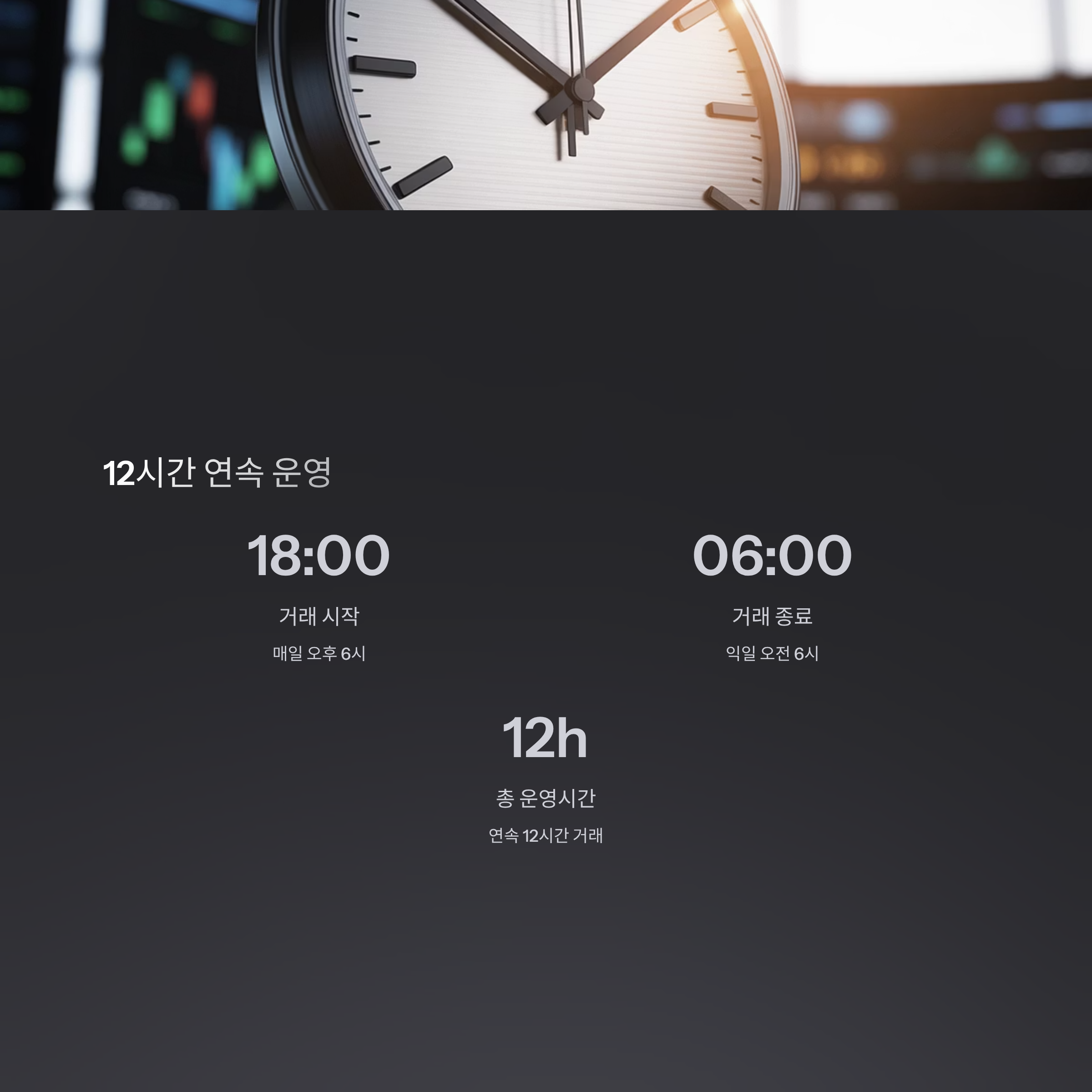 정규 거래 종료 이후 바로 시작하여 12시간 연속으로 진행되어 투자자의 시간 선택 폭이 크게 넓어졌습니다.