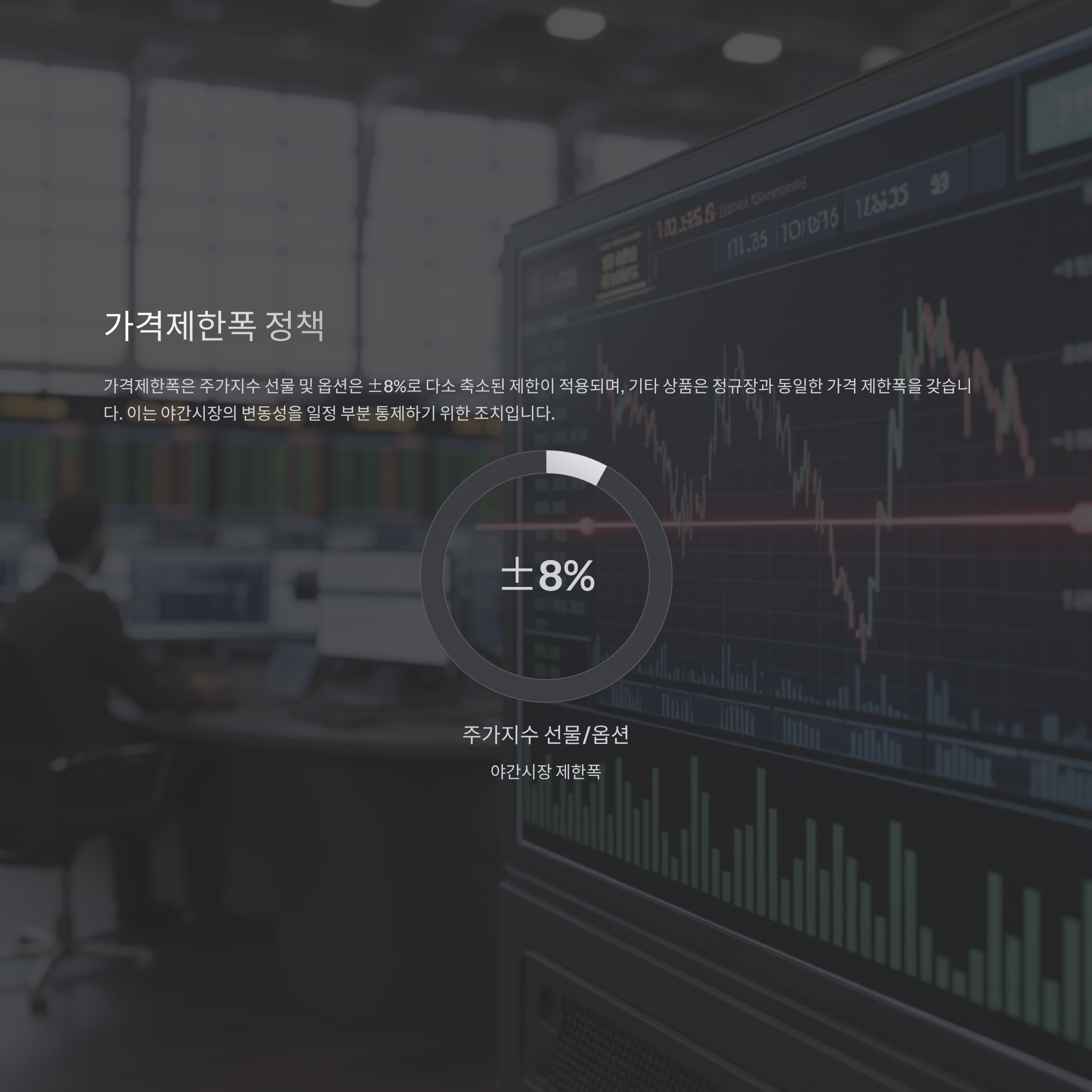 가격제한폭은 주가지수 선물 및 옵션은 ±8%로 다소 축소된 제한이 적용되며, 기타 상품은 정규장과 동일한 가격 제한폭을 갖습니다.