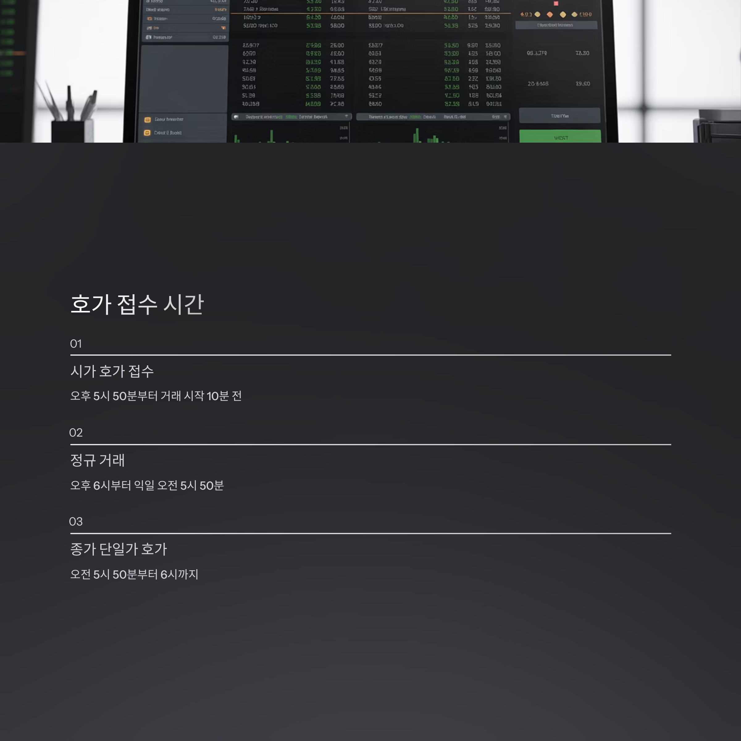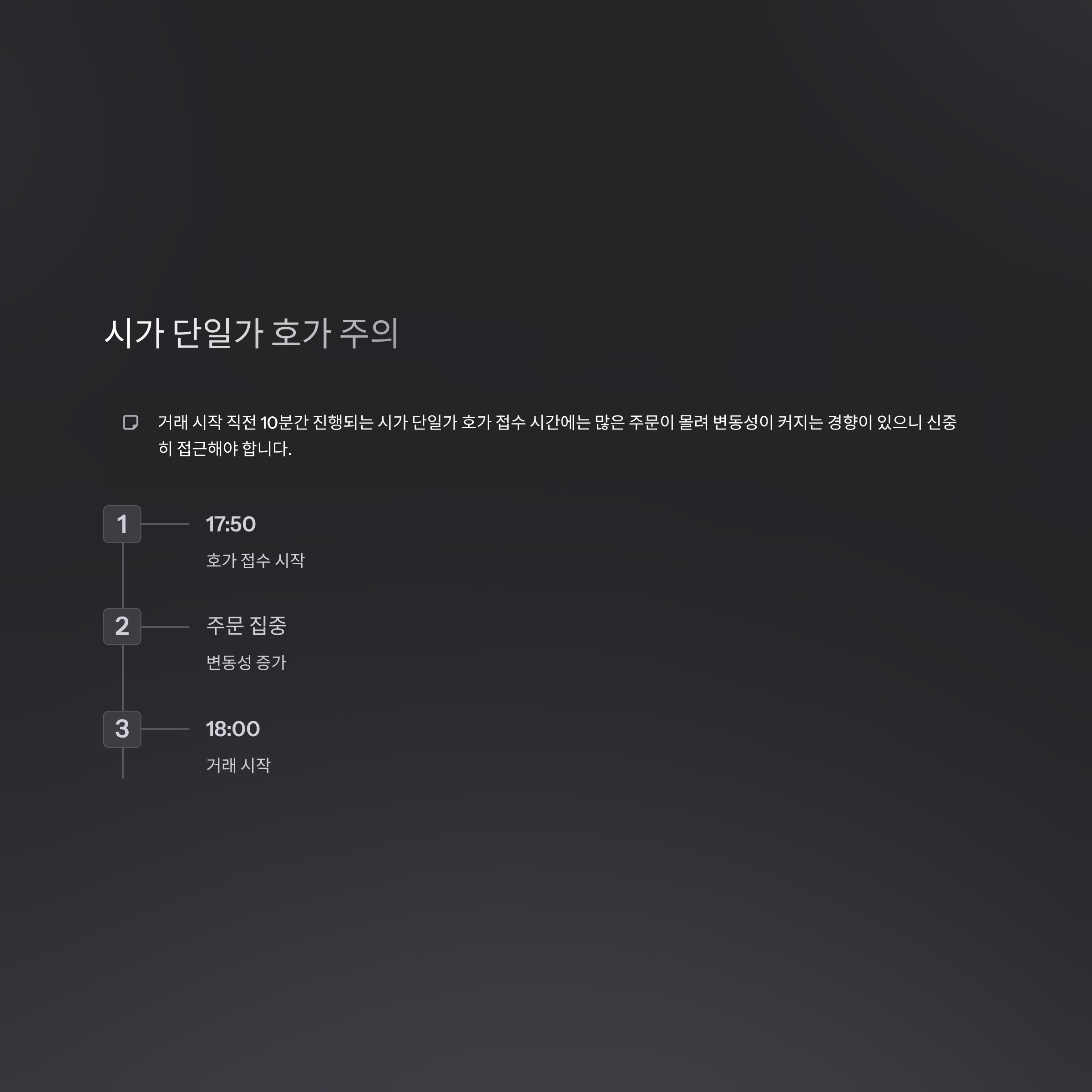 - 거래 시작 직전 10분간 진행되는 시가 단일가 호가 접수 시간에는 많은 주문이 몰려 변동성이 커지는 경향이 있으니 신중히 접근해야 합니다.