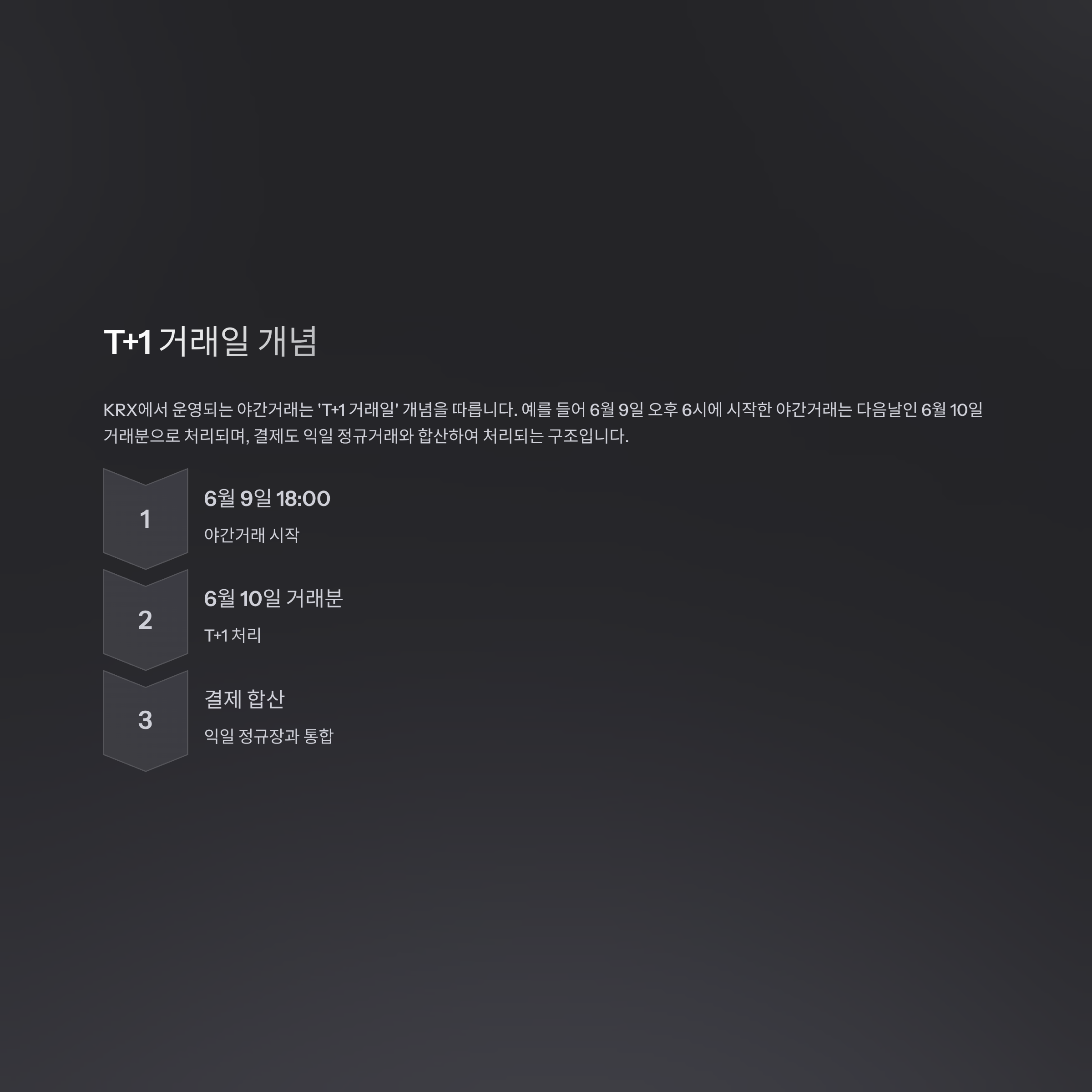 KRX에서 운영되는 야간거래는 ‘T+1 거래일’ 개념을 따릅니다.