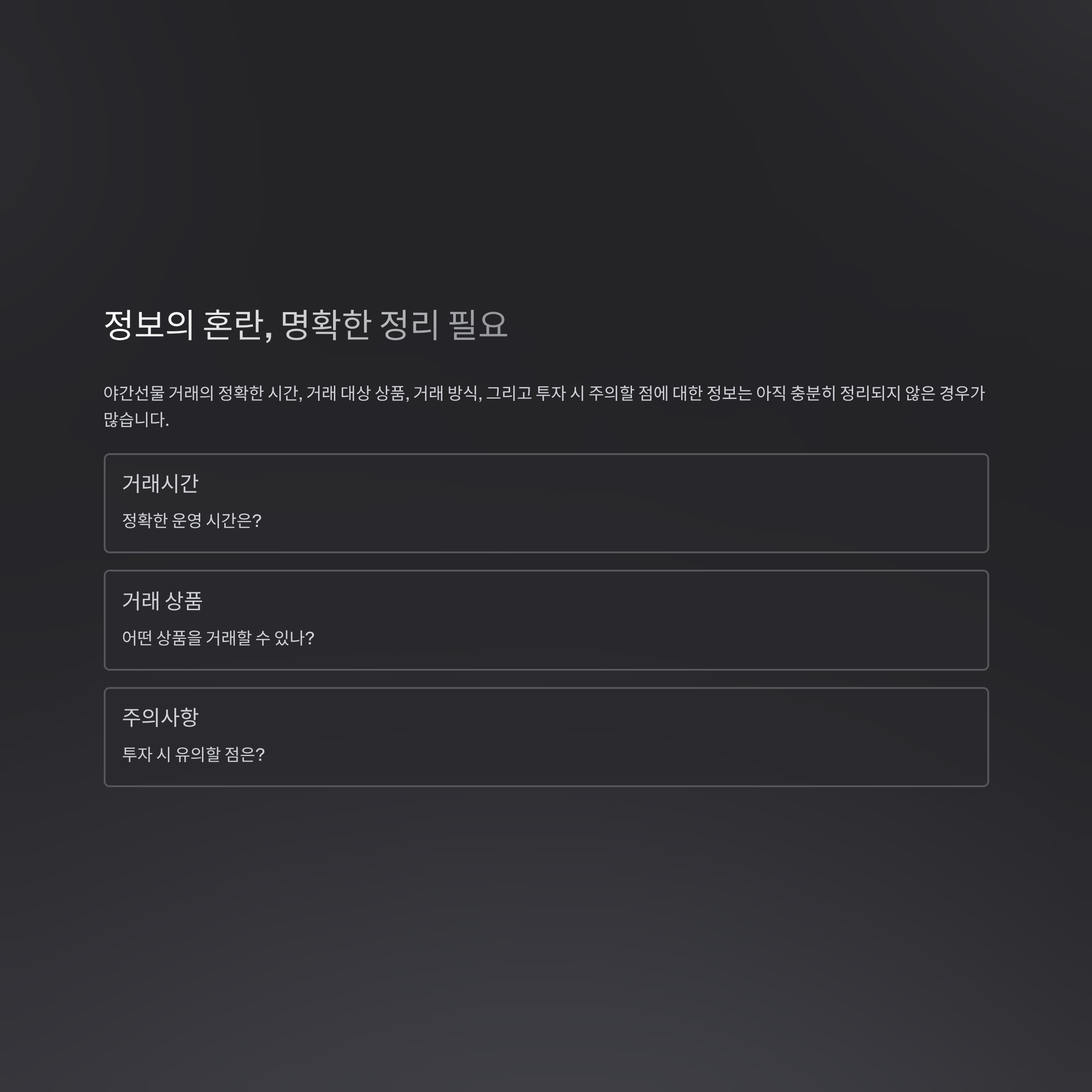 하지만 야간선물 거래의 정확한 시간, 거래 대상 상품, 거래 방식, 그리고 투자 시 주의할 점에 대한 정보는 아직 충분히 정리되지 않은 경우가 많아 혼란이 있습니다.