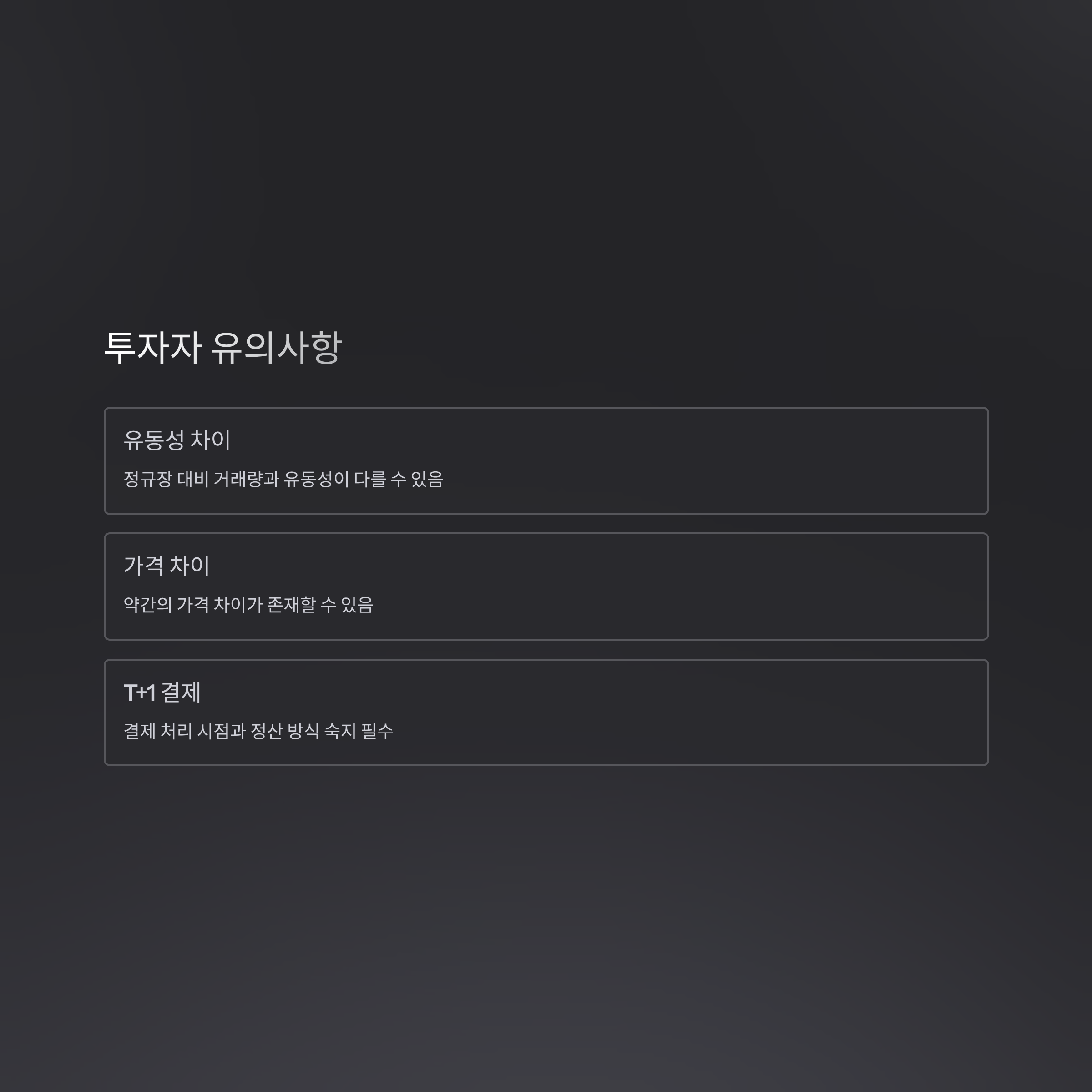 투자자는 야간거래 시 정규장 대비 거래량과 유동성이 다를 수 있음을 인지해야 하며, 약간의 가격 차이가 존재할 수 있습니다.