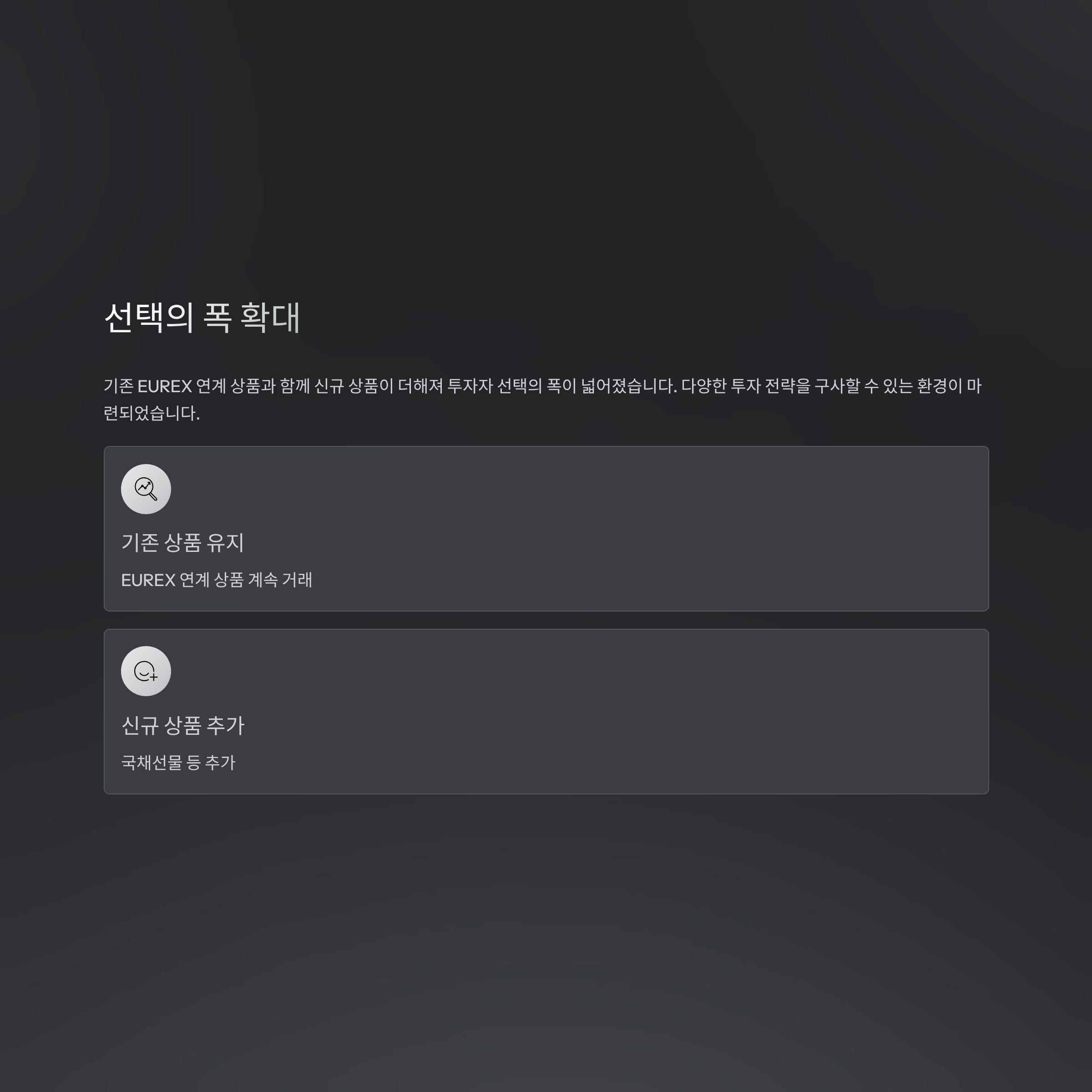 기존 EUREX 연계 상품과 함께 신규 상품이 더해져 투자자 선택의 폭이 넓어졌습니다.