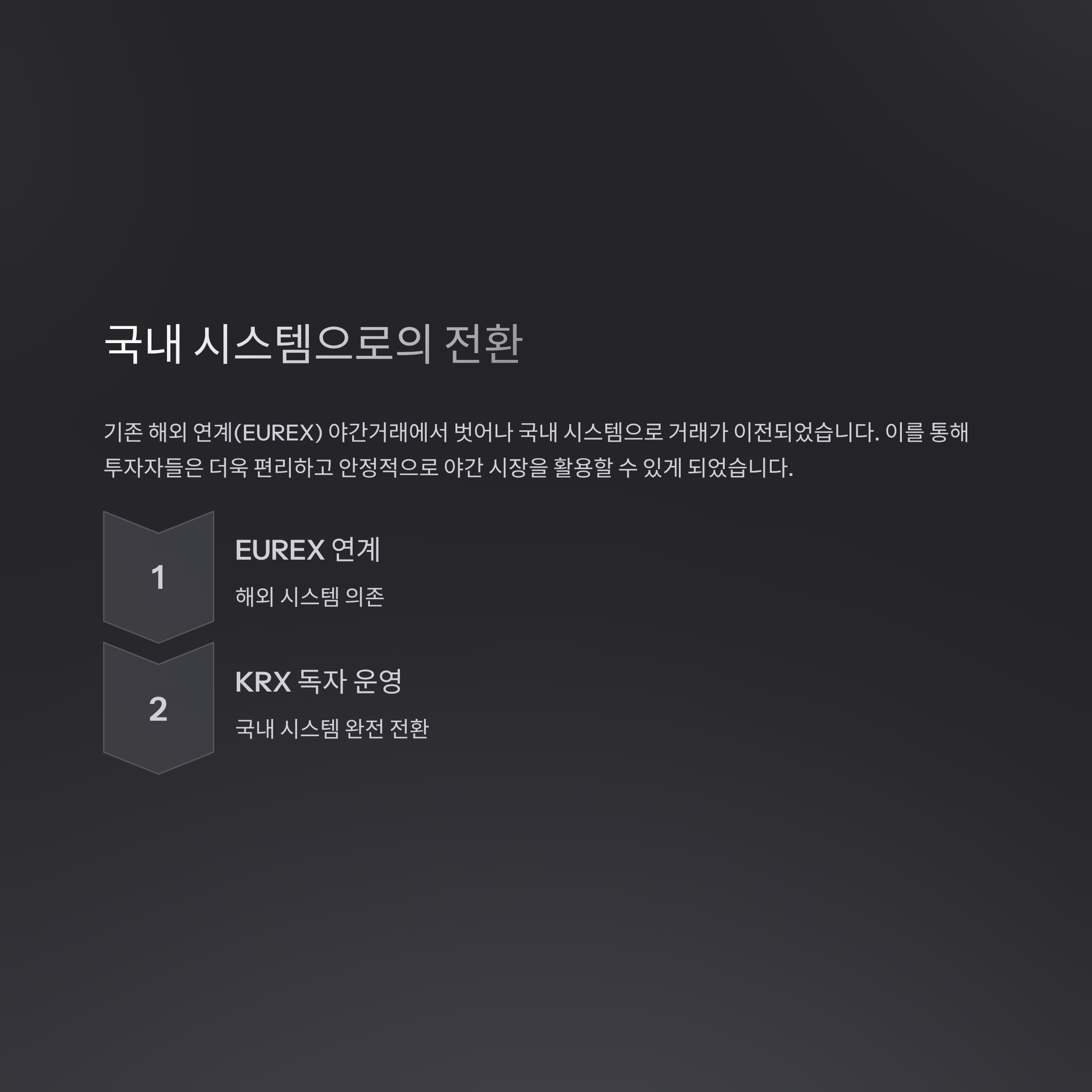기존 해외 연계(EUREX) 야간거래에서 벗어나 국내 시스템으로 거래가 이전되며 투자자들이 좀 더 편리하고 안정적으로 야간 시장을 활용할 수 있게 되었습니다.
