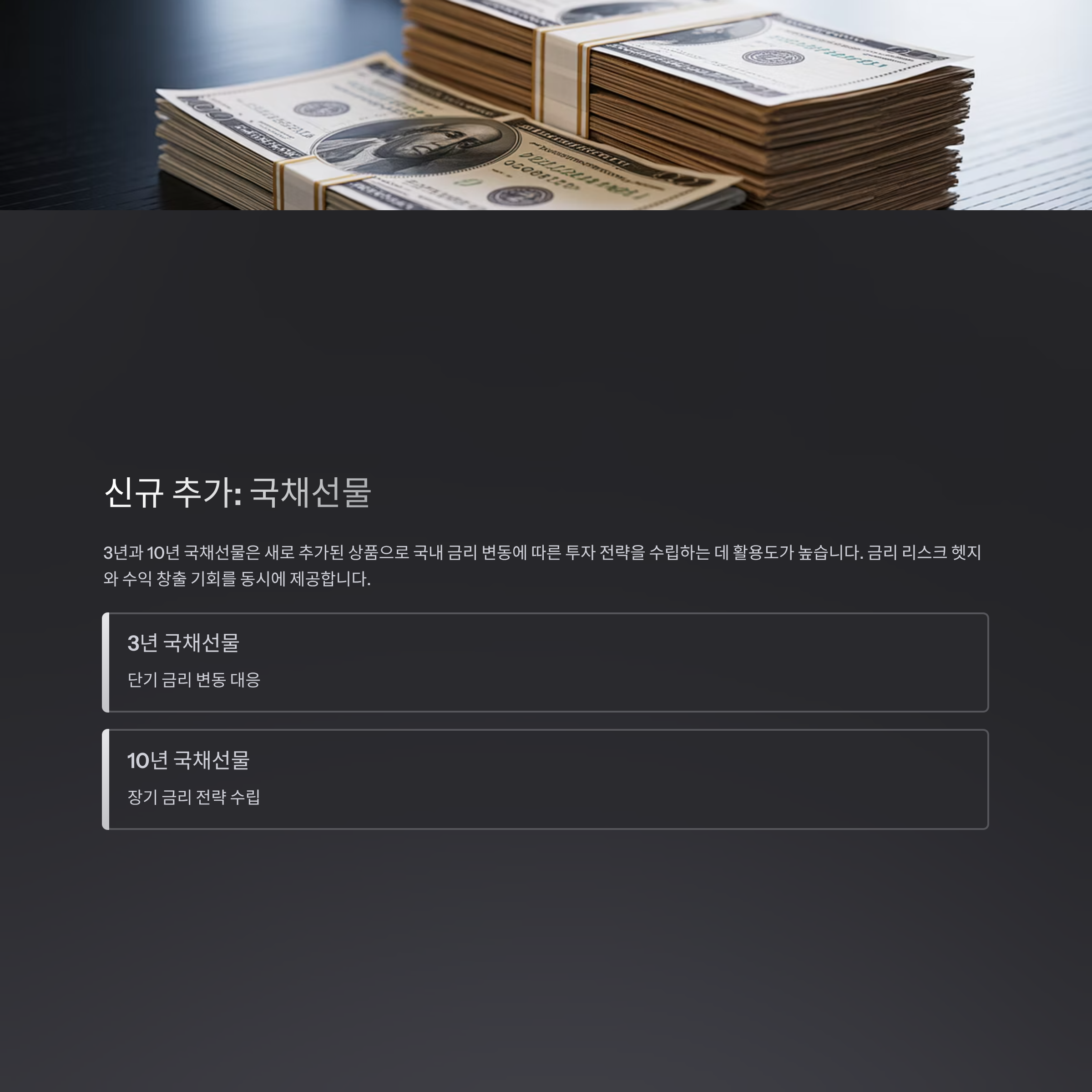 이 중 3년과 10년 국채선물은 새로 추가된 상품으로 국내 금리 변동에 따른 투자 전략을 수립하는 데 활용도가 높습니다.