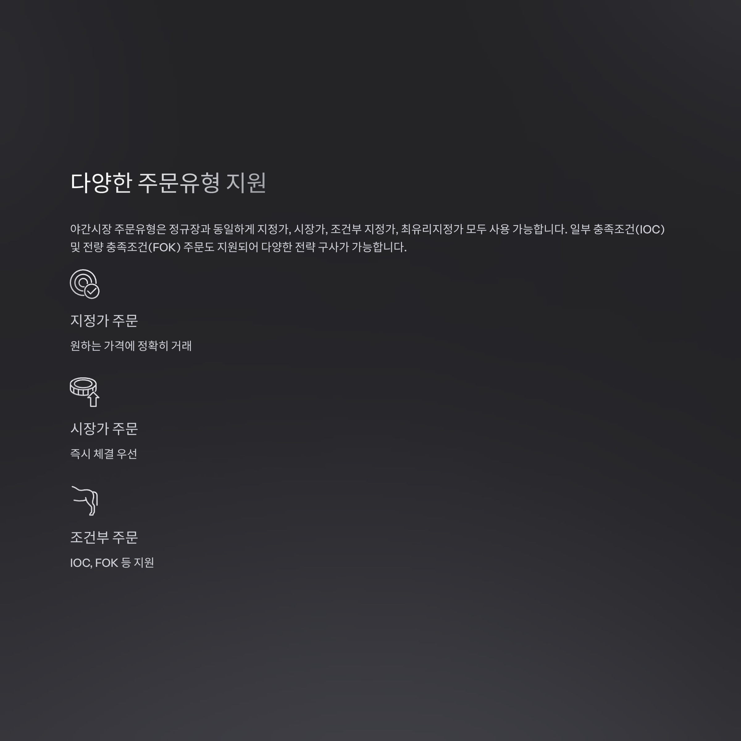 일부 충족조건(IOC) 및 전량 충족조건(FOK) 주문도 지원되어 다양한 전략 구사가 가능합니다.