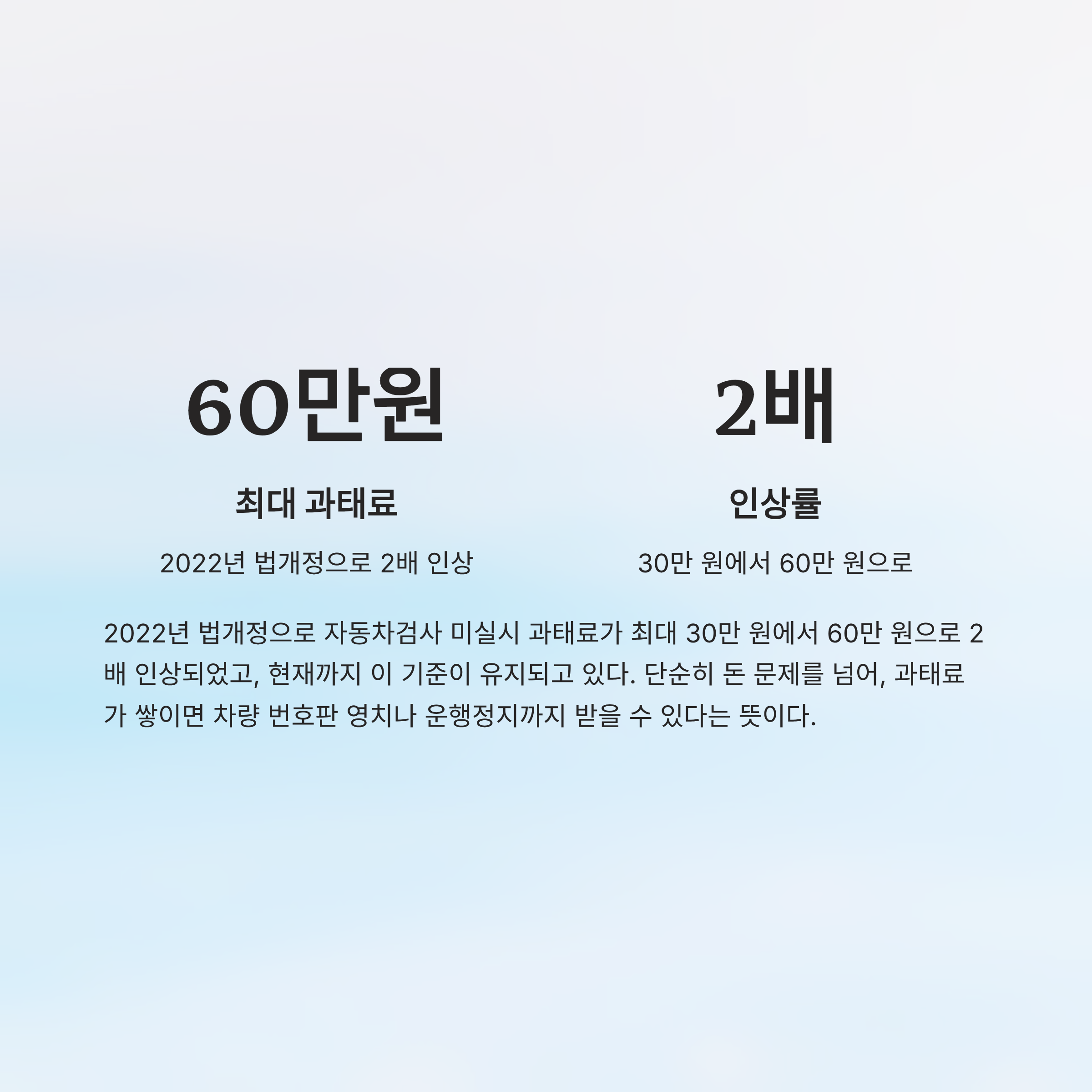 2022년 법개정으로 자동차검사 미실시 과태료가 최대 30만 원에서 60만 원으로 2배 인상되었고, 현재까지 이 기준이 유지되고 있다.