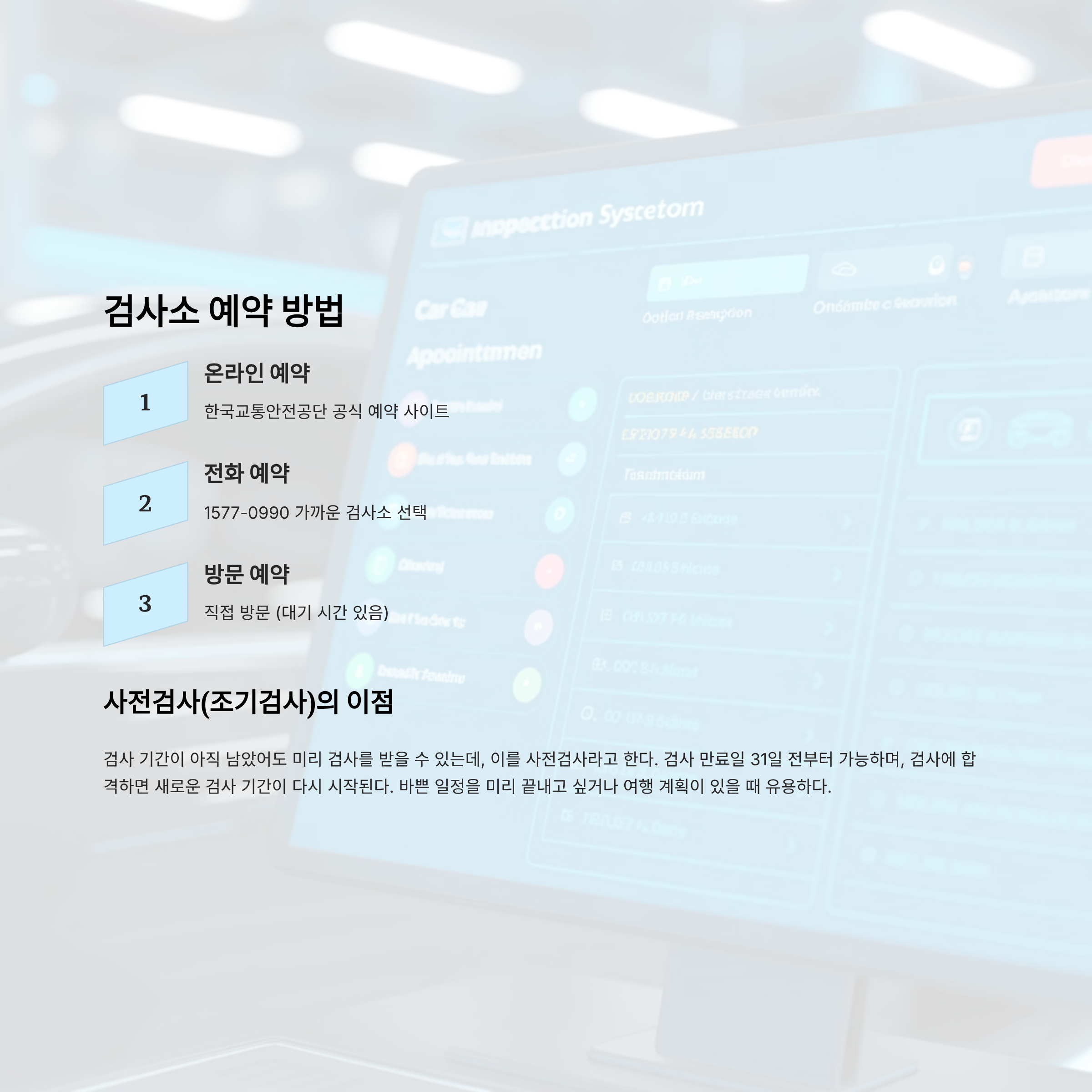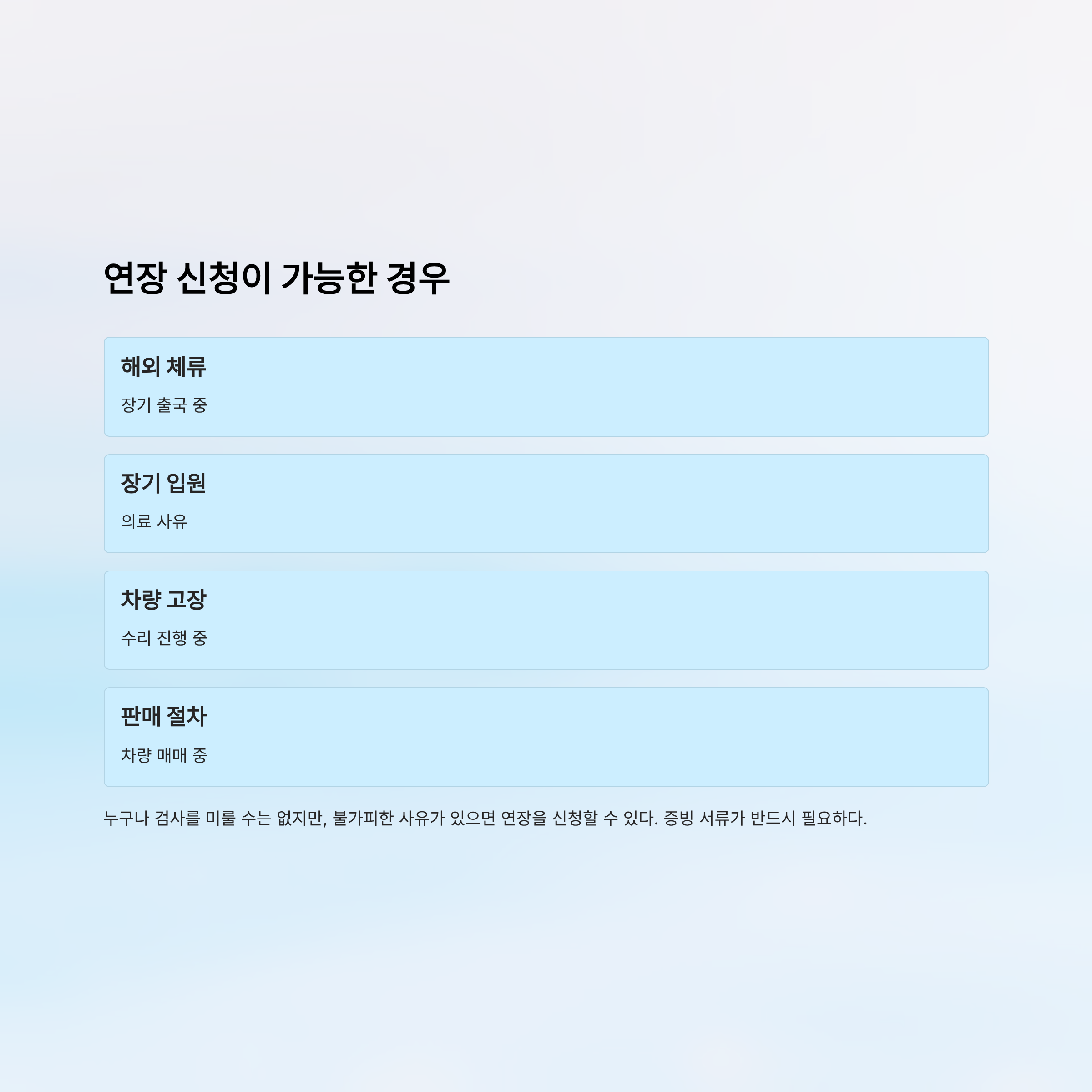 검사 기간이 아직 남았어도 미리 검사를 받을 수 있는데, 이를 사전검사라고 한다. 검사 만료일 31일 전부터 가능하며, 검사에 합격하면 새로운 검사 기간이 다시 시작된다. 바쁜 일정을 미리 끝내고 싶거나 여행 계획이 있을 때 유용하다.
