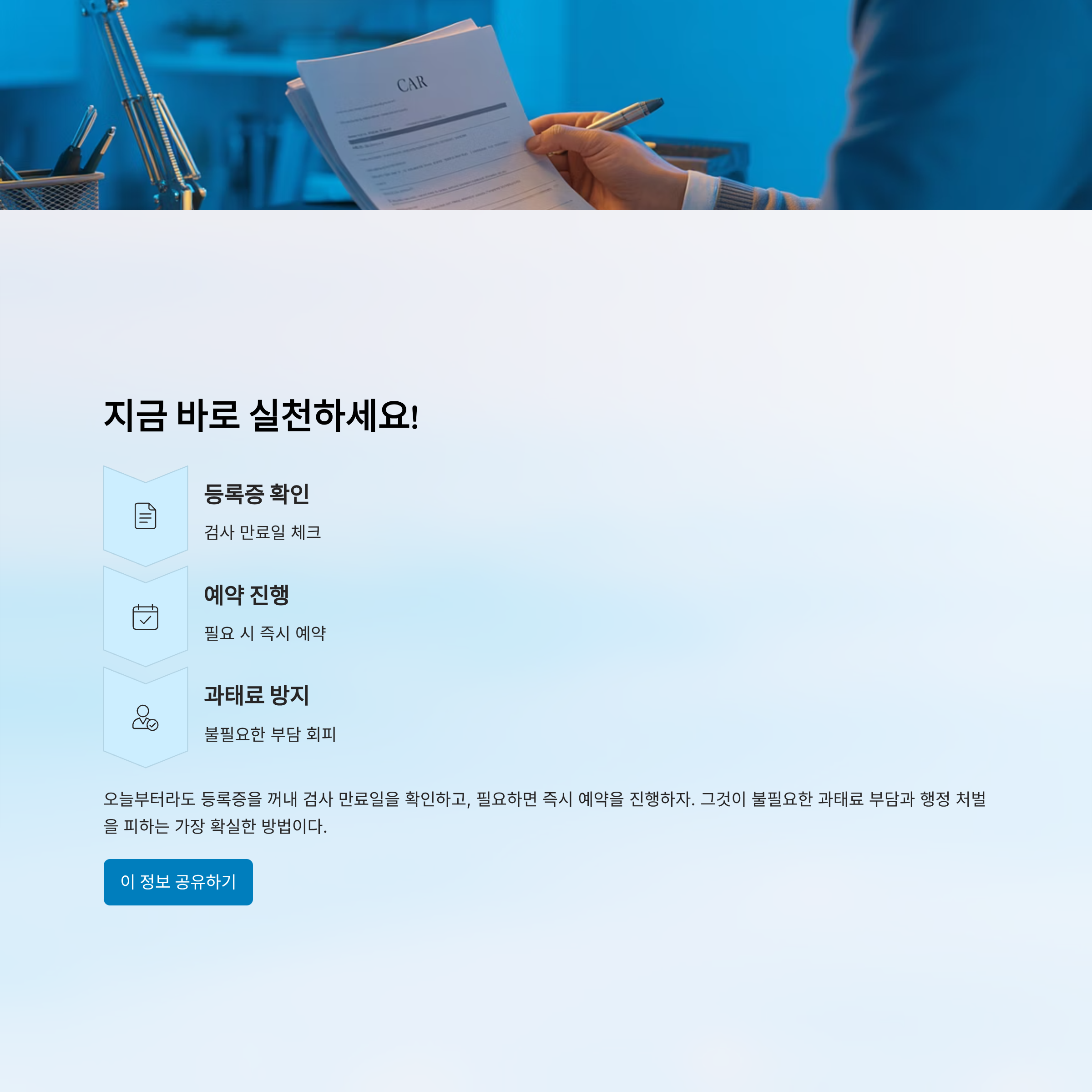 오늘부터라도 등록증을 꺼내 검사 만료일을 확인하고, 필요하면 즉시 예약을 진행하자. 그것이 불필요한 과태료 부담과 행정 처벌을 피하는 가장 확실한 방법이다.