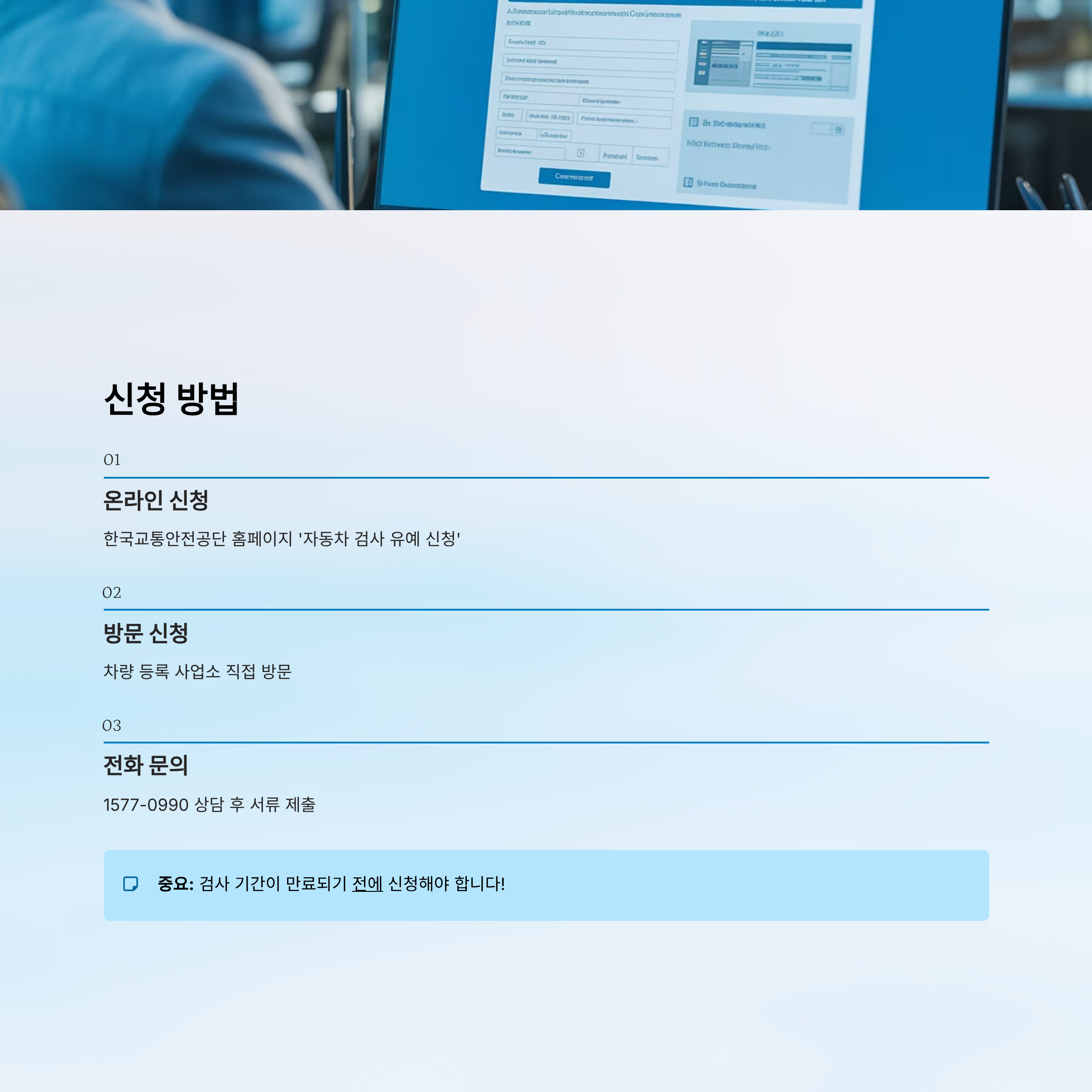 한국교통안전공단 홈페이지에서 '자동차 검사 유예 신청'을 찾아 온라인으로 신청하거나, 차량 등록 사업소를 방문하여 직접 신청할 수 있다.