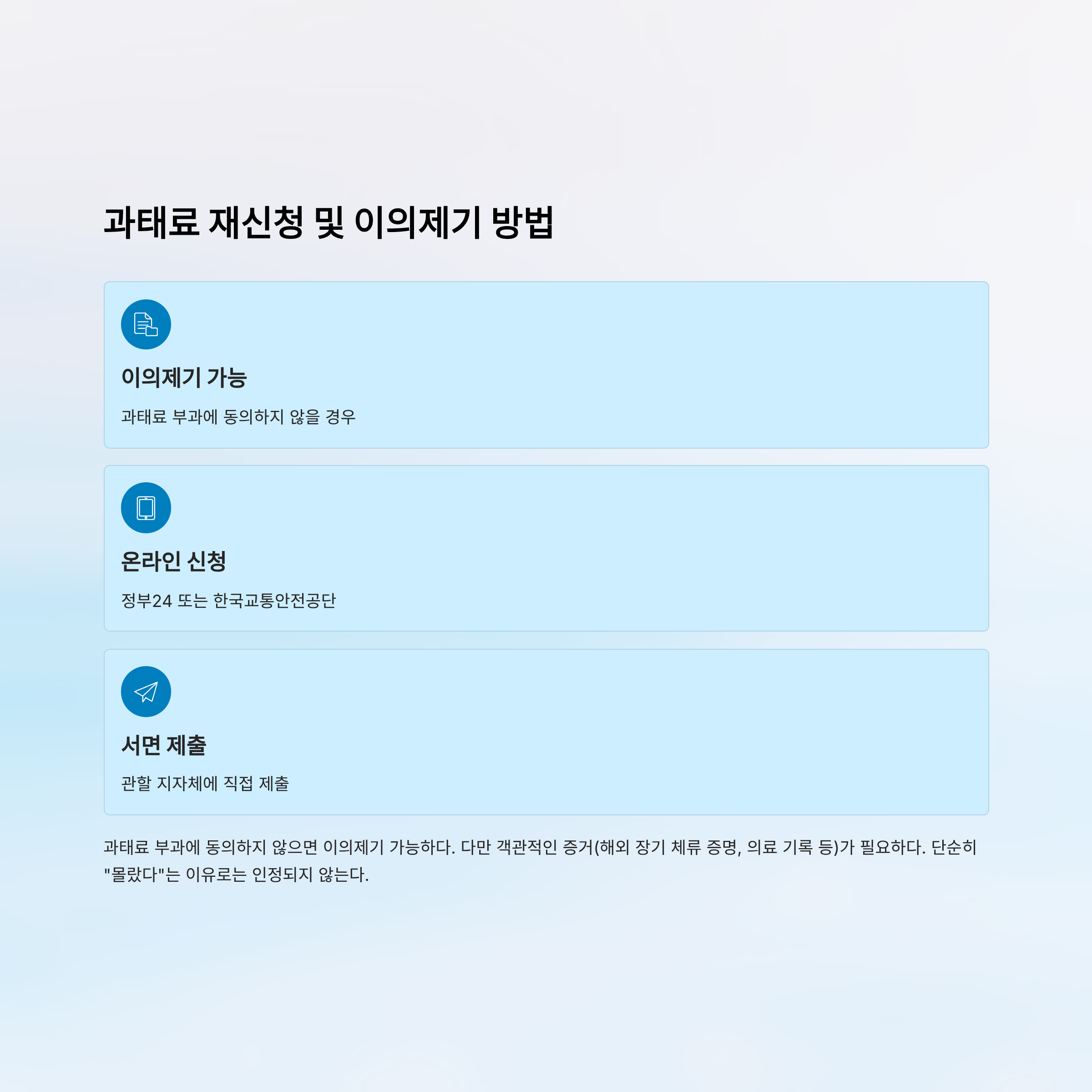과태료 부과에 동의하지 않으면 이의제기 가능하다. 정부24나 한국교통안전공단에서 '과태료 이의신청' 게시판을 찾아 신청하거나, 서면으로 관할 지자체에 제출할 수 있다. 다만 객관적인 증거(해외 장기 체류 증명, 의료 기록 등)가 필요하다.
