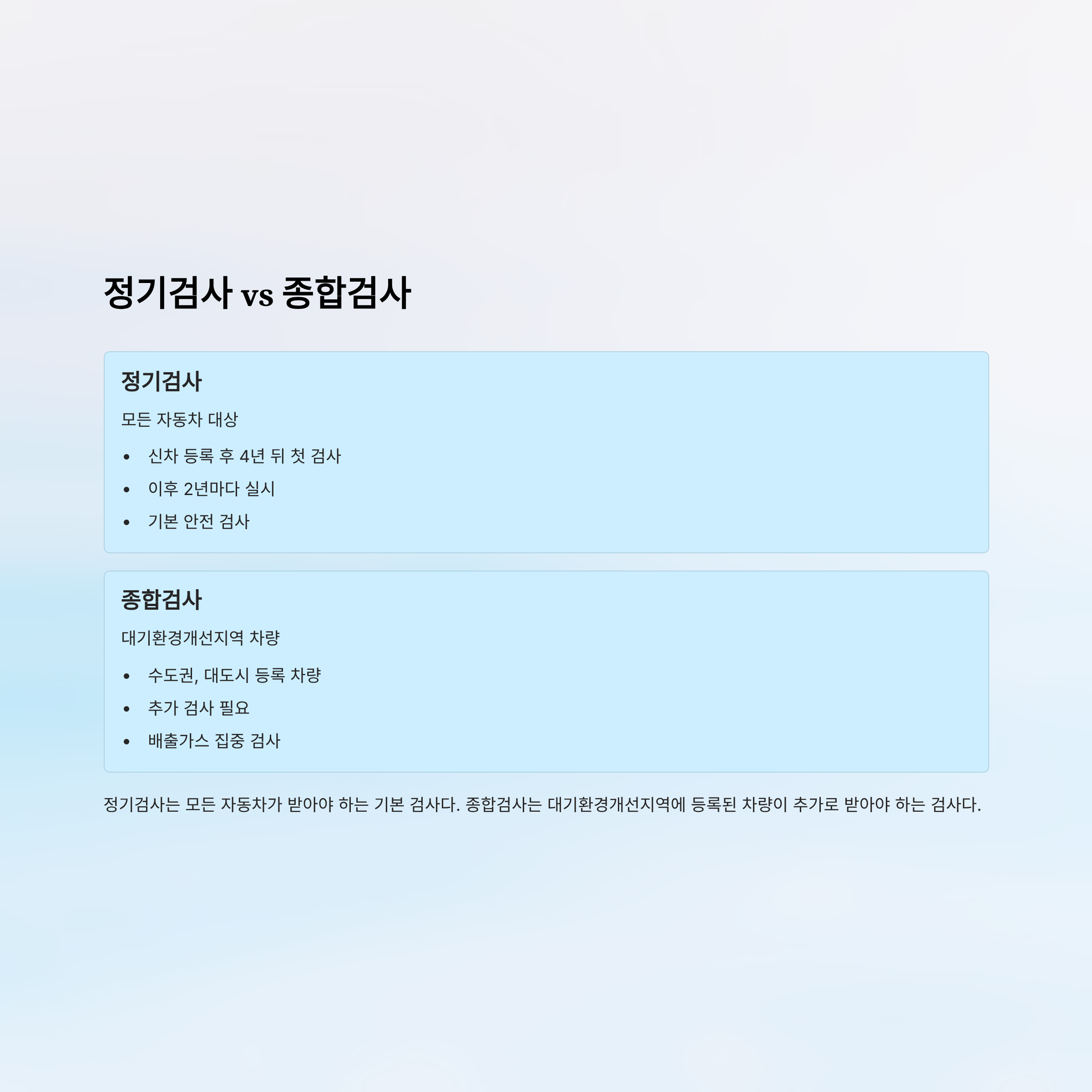 종합검사는 대기환경개선지역(수도권, 대도시 등)에 등록된 차량이 추가로 받아야 하는 검사다.