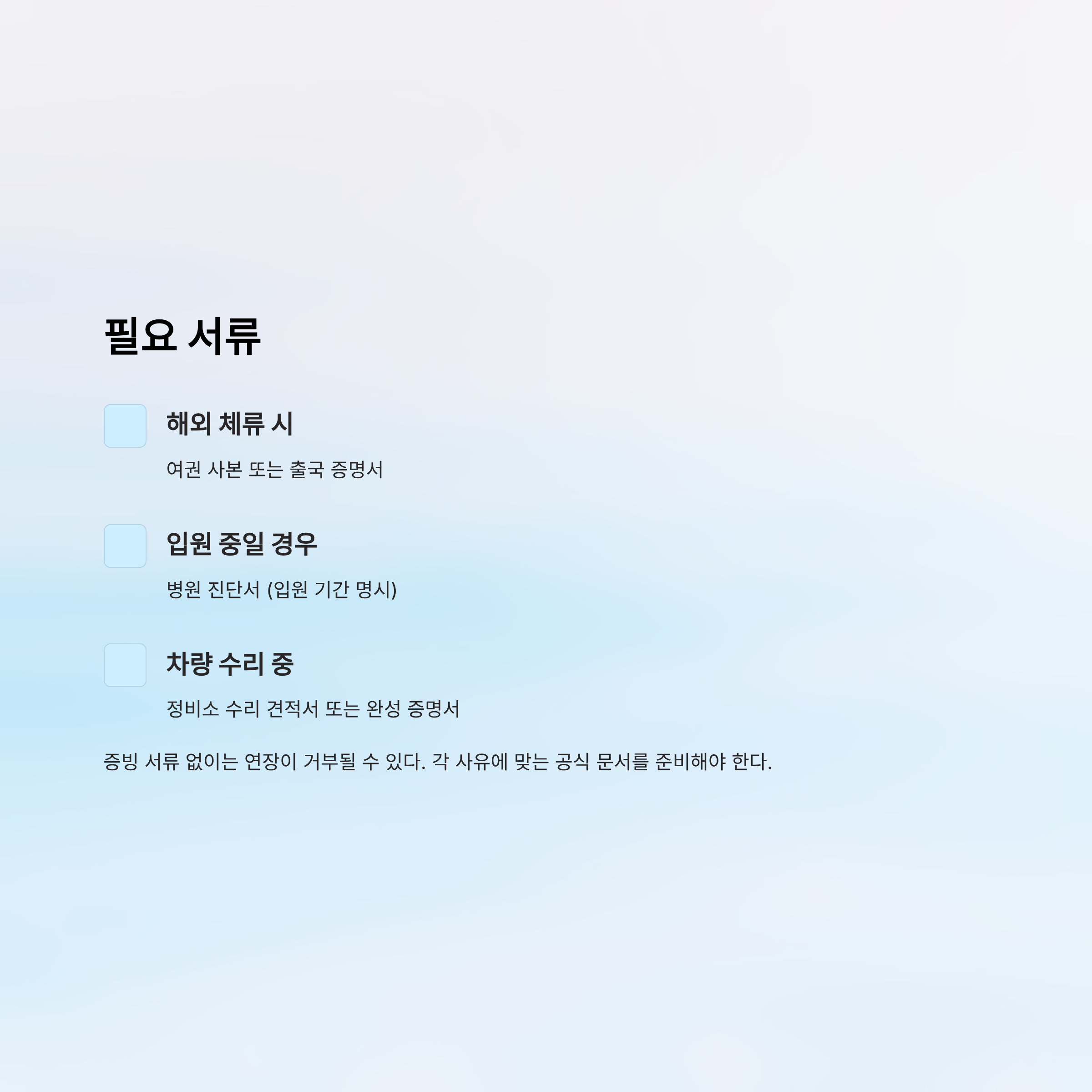 해외 체류 시 여권 사본 또는 출국 증명서, 입원 중일 경우 병원 진단서, 차량 수리 중일 경우 정비소 수리 견적서 또는 완성 증명서 등이 필요하다.