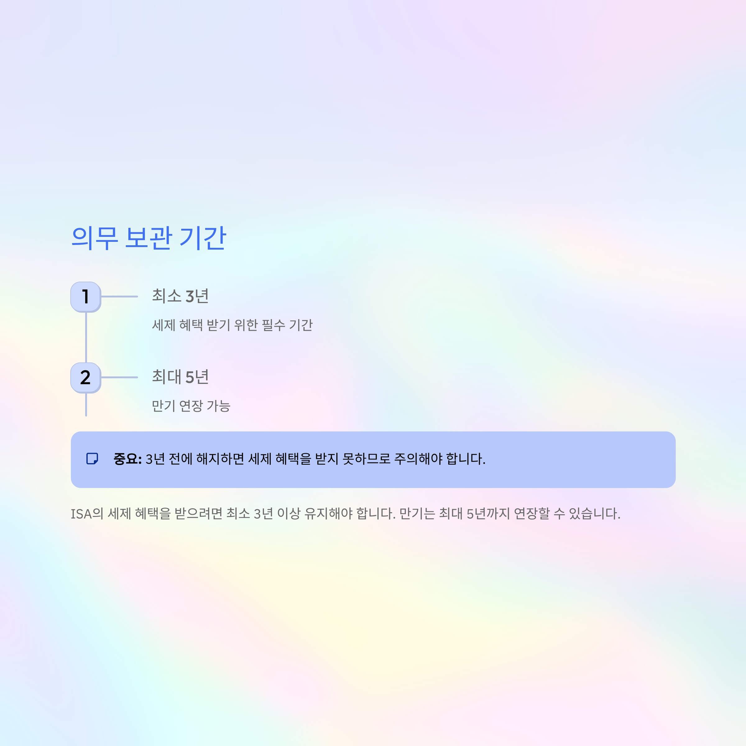 ISA의 세제 혜택을 받으려면 최소 3년 이상 유지해야 한다. 만기는 최대 5년까지 연장할 수 있다. 3년 전에 해지하면 세제 혜택을 받지 못하므로 주의해야 한다.