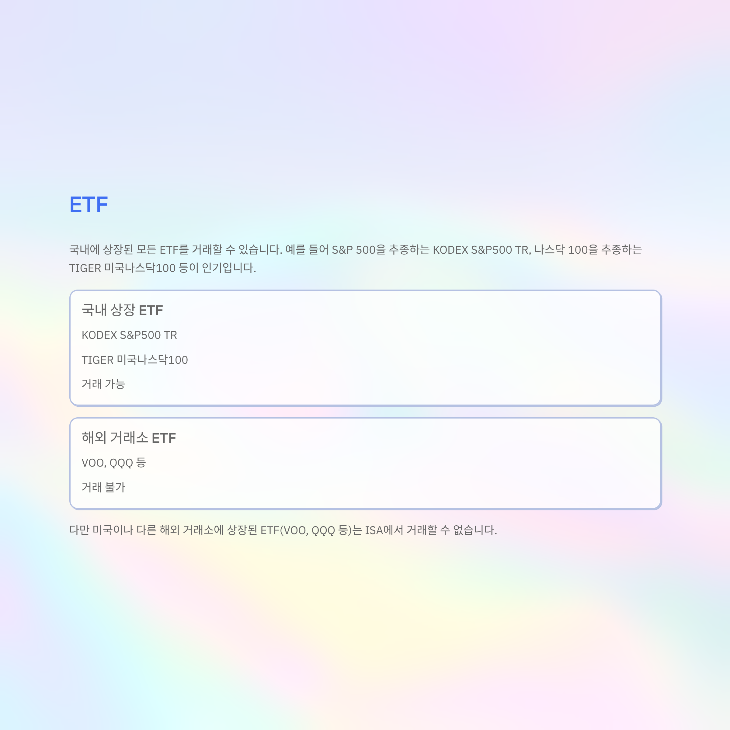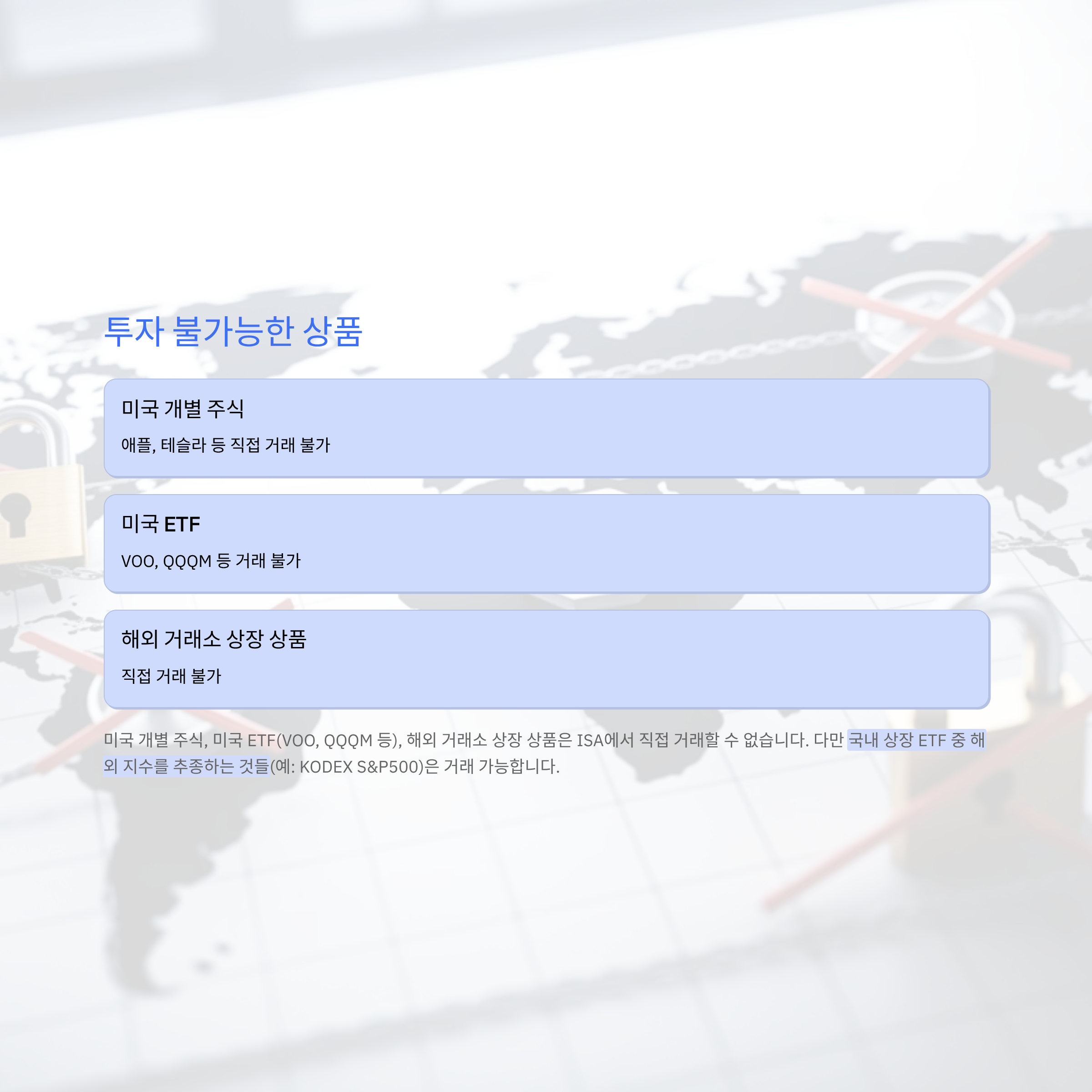 미국 개별 주식, 미국 ETF(VOO, QQQM 등), 해외 거래소 상장 상품은 ISA에서 직접 거래할 수 없다. 다만 국내 상장 ETF 중 해외 지수를 추종하는 것들(예: KODEX S&P500)은 거래 가능하다.