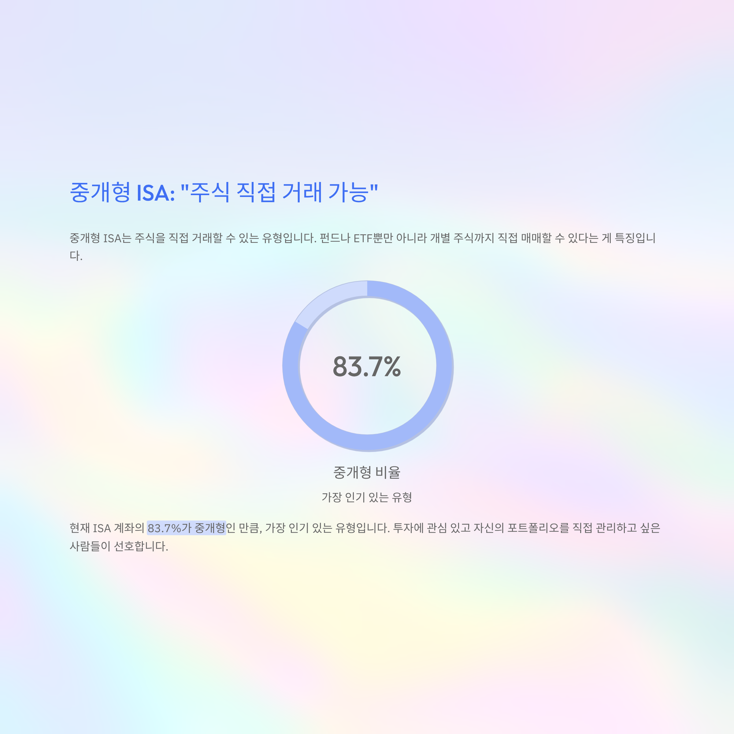 현재 ISA 계좌의 83.7%가 중개형인 만큼, 가장 인기 있는 유형이다.