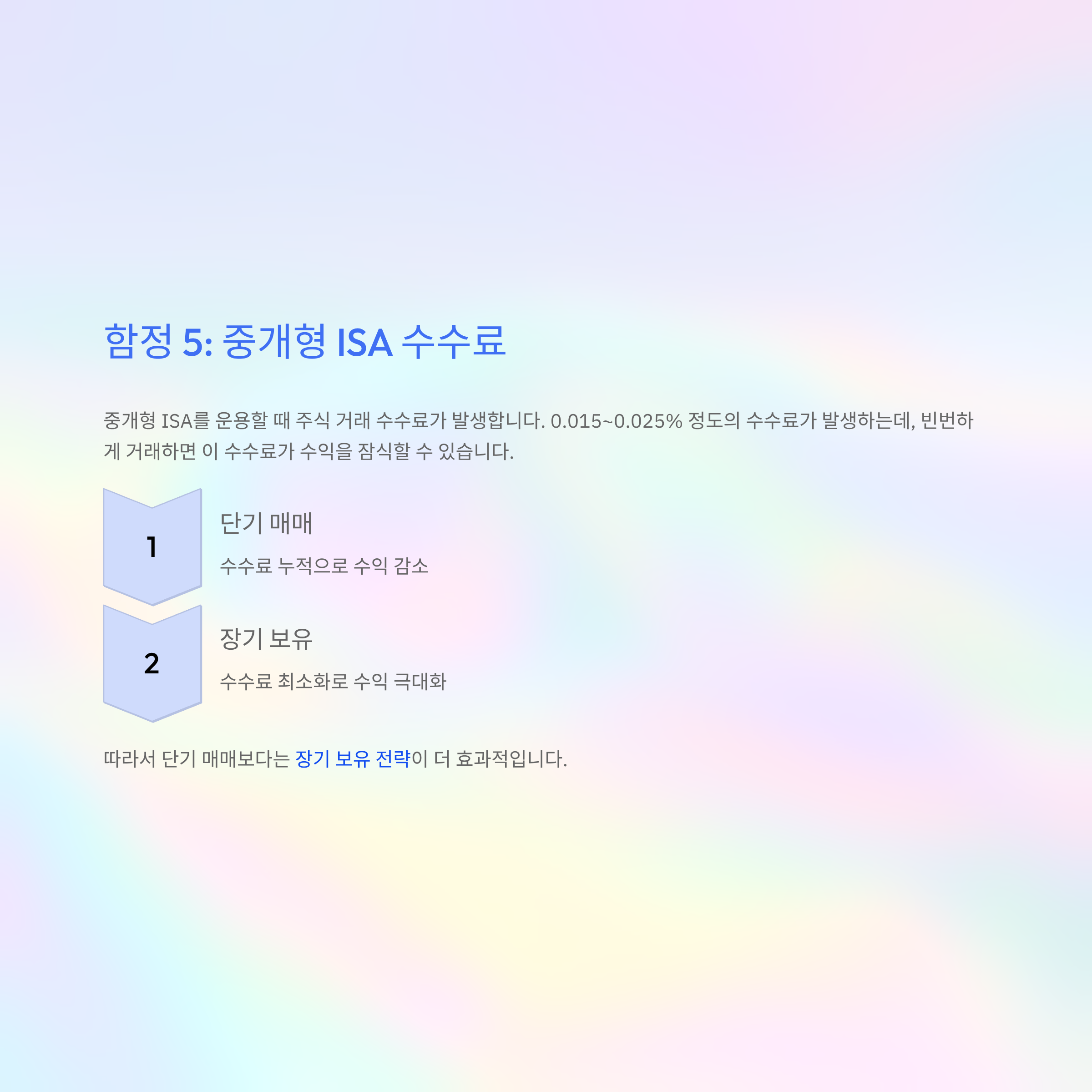 중개형 ISA를 운용할 때 주식 거래 수수료가 발생한다. 0.015~0.025% 정도의 수수료가 발생하는데, 빈번하게 거래하면 이 수수료가 수익을 잠식할 수 있다. 따라서 단기 매매보다는 장기 보유 전략이 더 효과적이다.