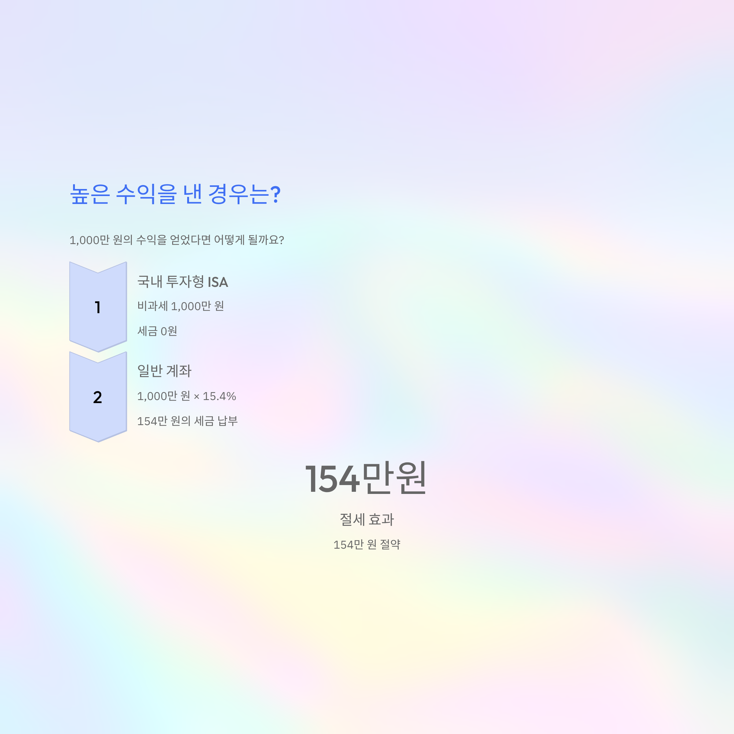 일반 계좌: 1,000만 원 × 15.4% = 154만 원의 세금 납부