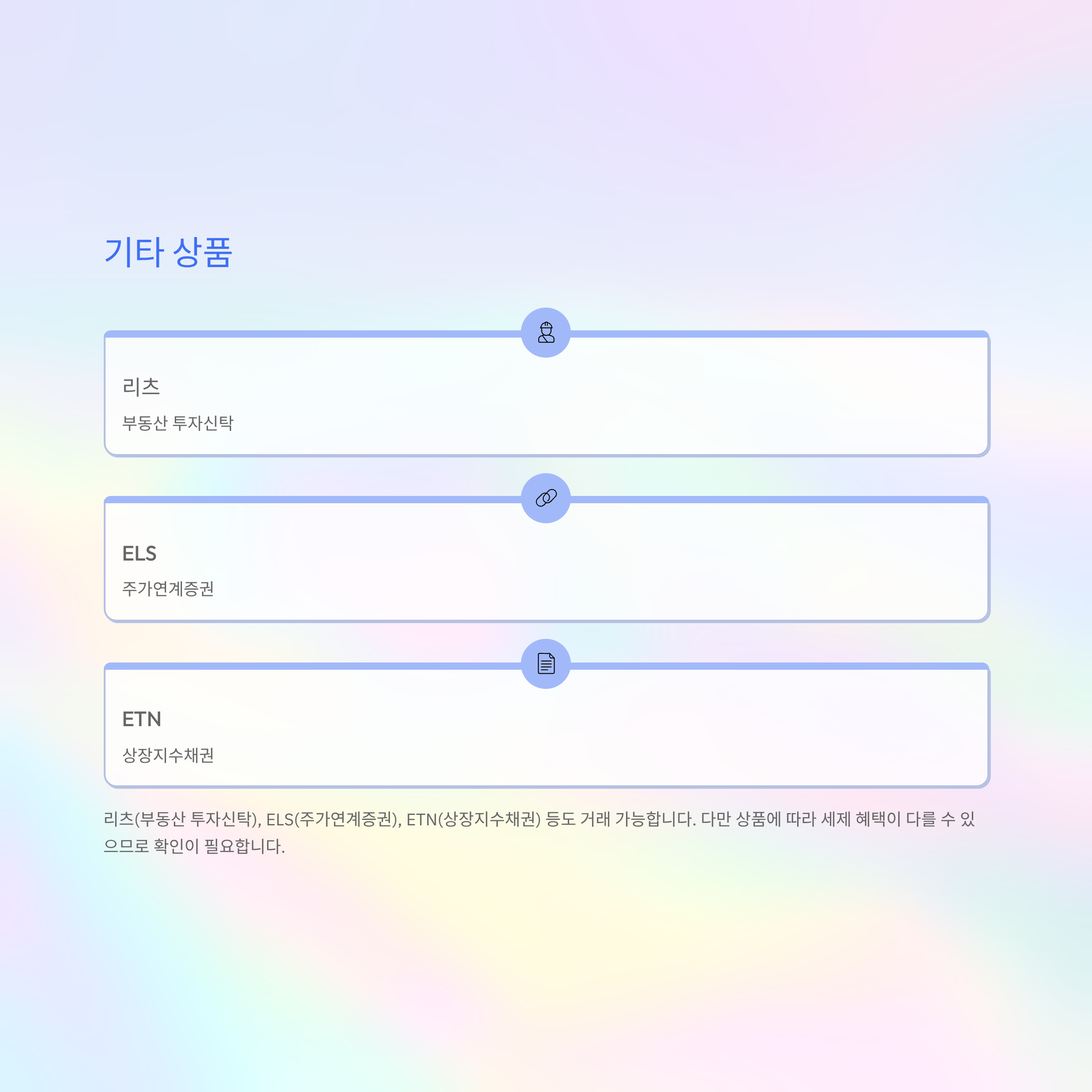 리츠(부동산 투자신탁), ELS(주가연계증권), ETN(상장지수채권) 등도 거래 가능하다. 다만 상품에 따라 세제 혜택이 다를 수 있으므로 확인이 필요하다.
