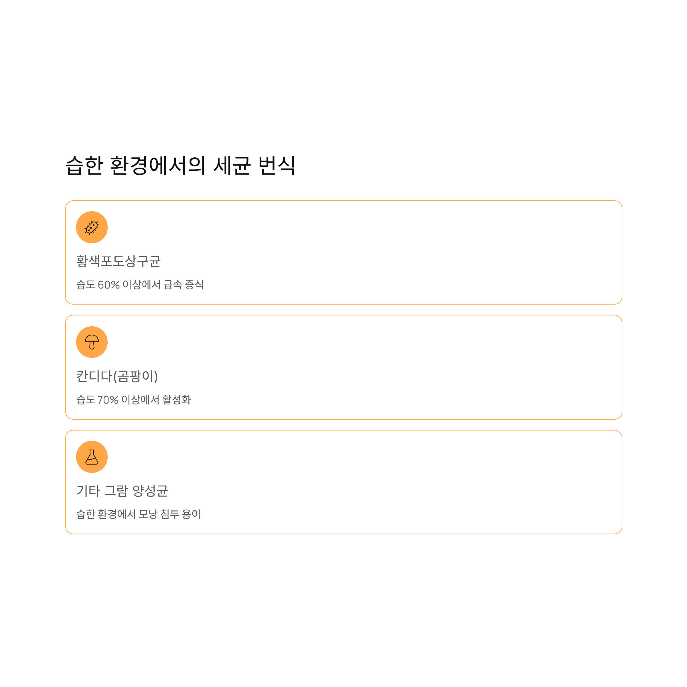 황색포도상구균: 습도 60% 이상에서 급속 증식.