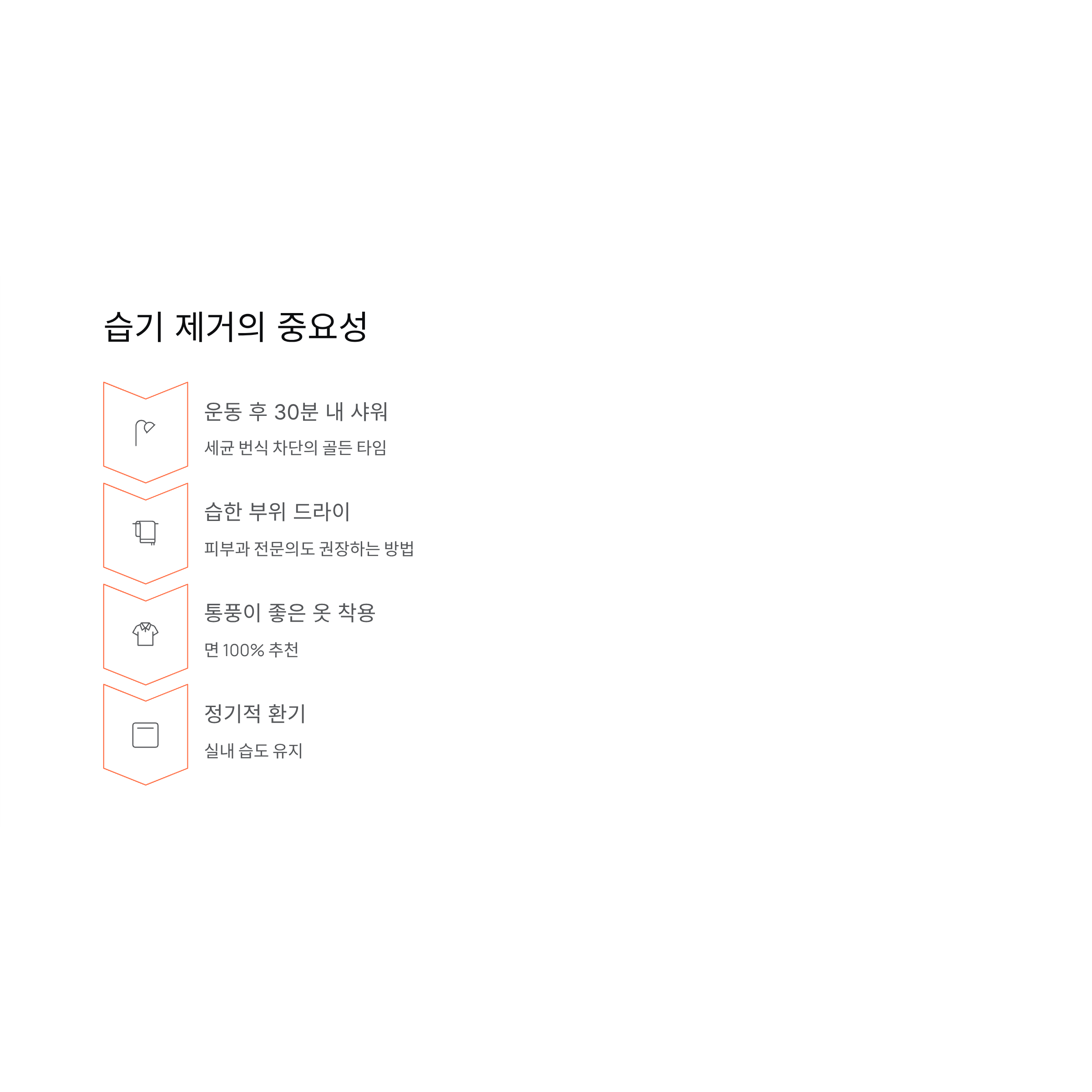 운동 후 30분 내 샤워: 세균 번식 차단.