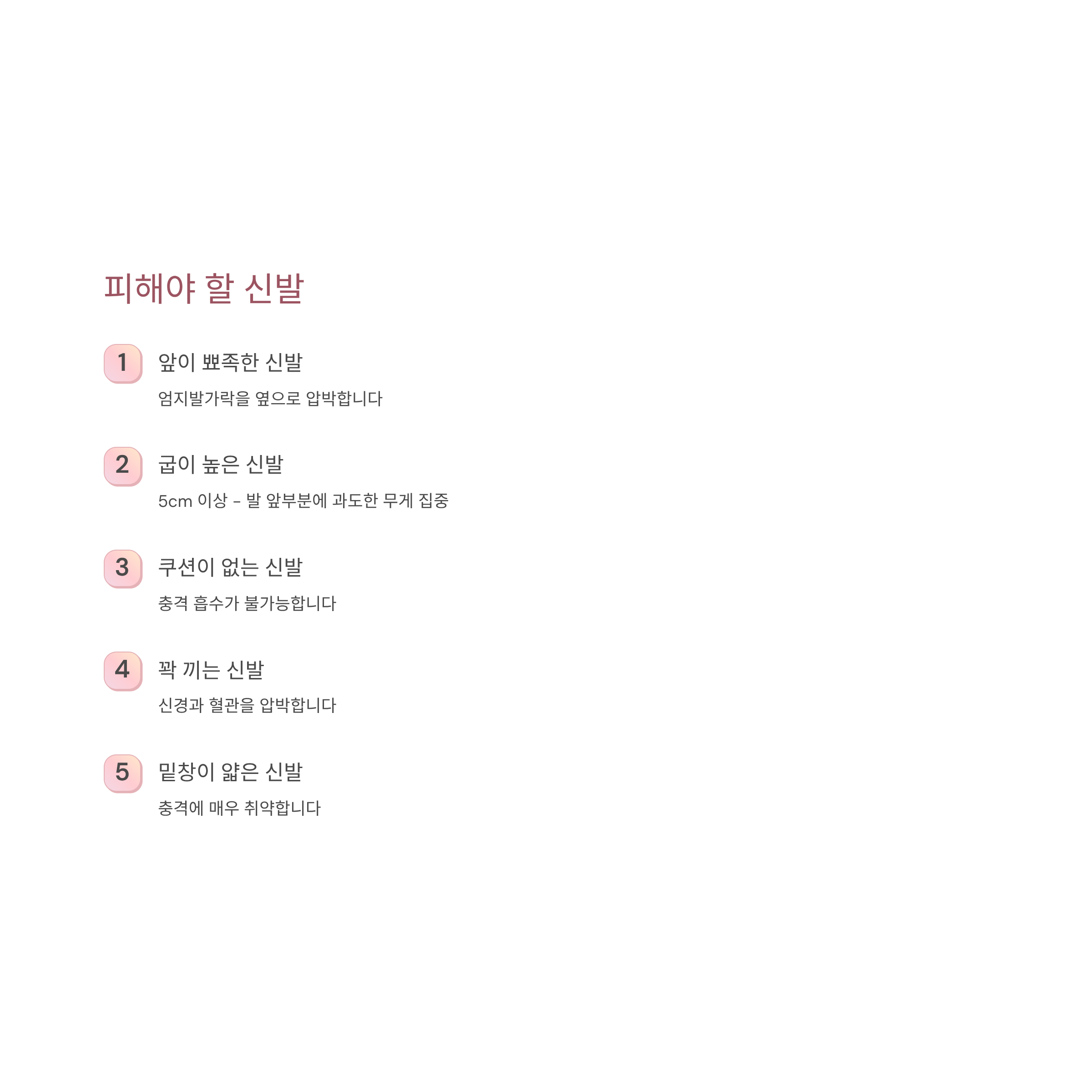 2) 굽이 높은 신발(5cm 이상) - 발 앞부분에 과도한 무게 집중.