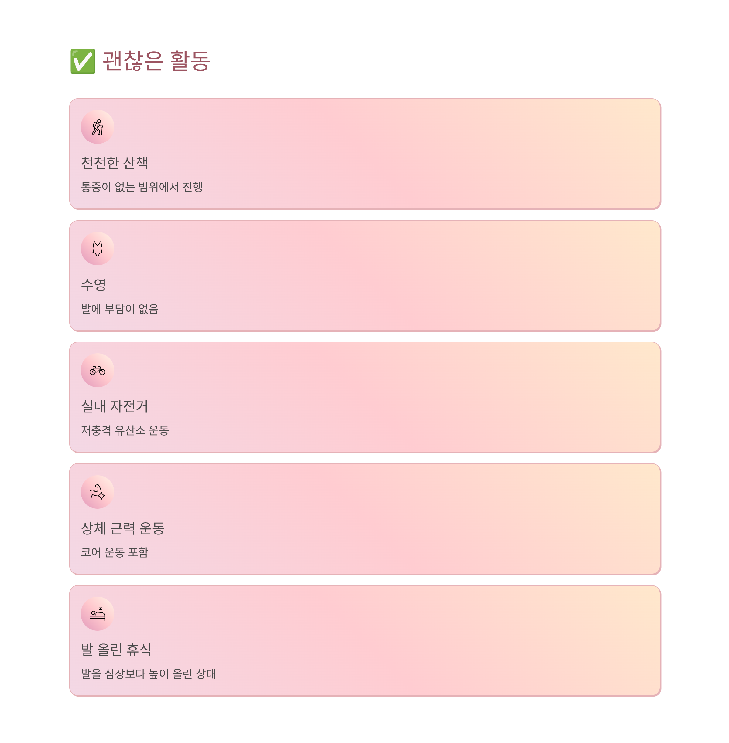 수영, 실내 자전거 같은 저충격 운동.