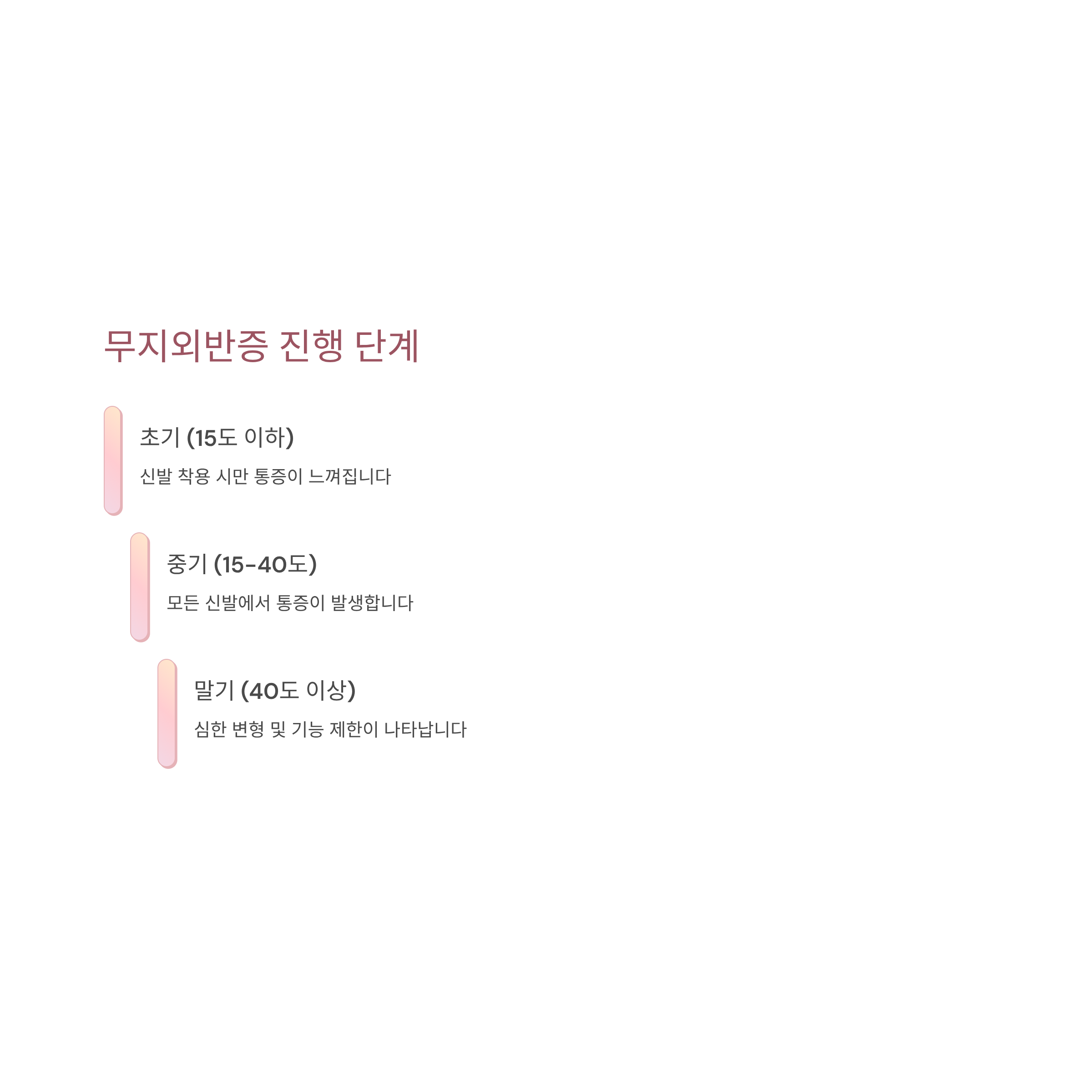 초기(15도 이하): 신발 착용 시만 통증.