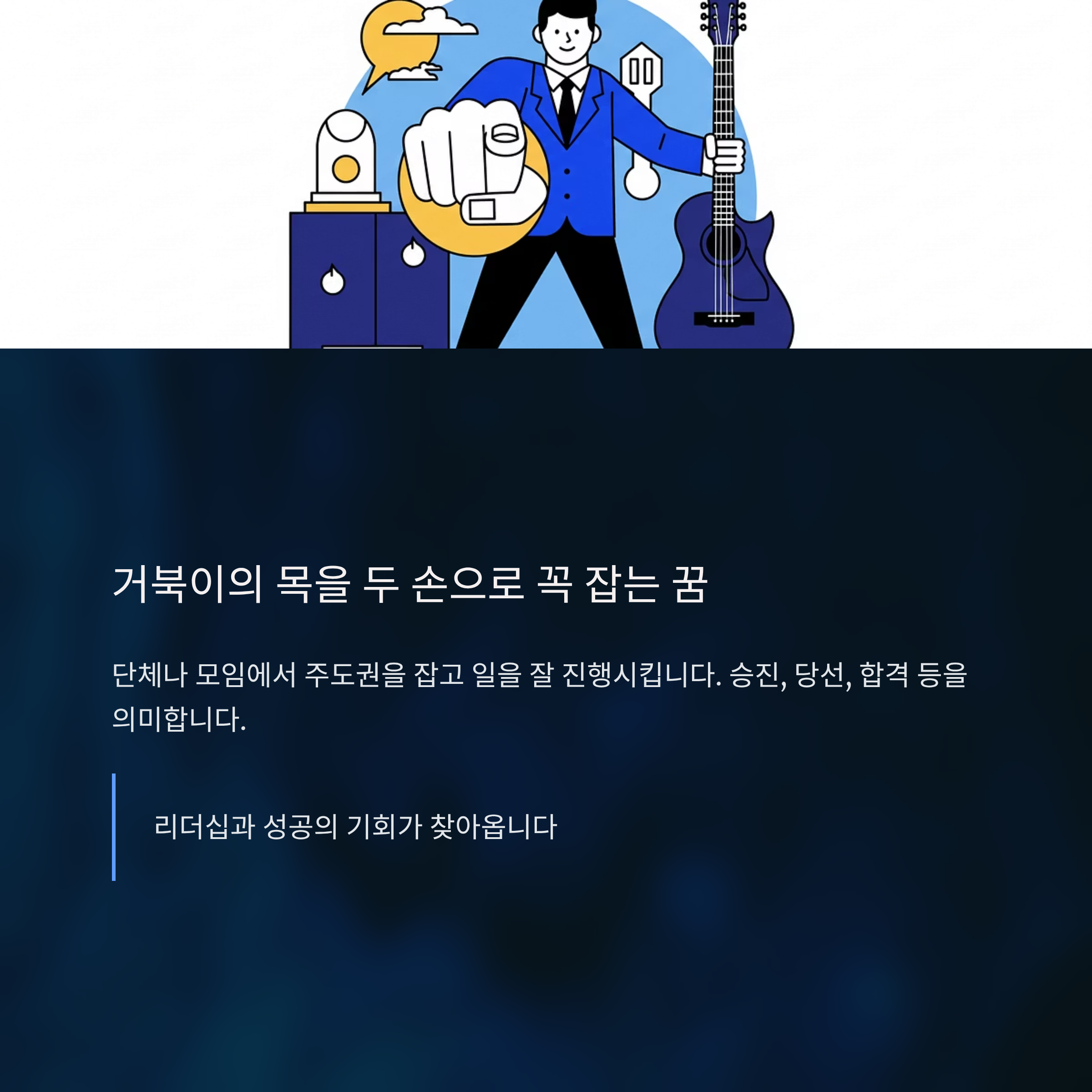 단체나 모임에서 주도권을 잡고 일을 잘 진행시킵니다. 승진, 당선, 합격 등을 의미합니다.