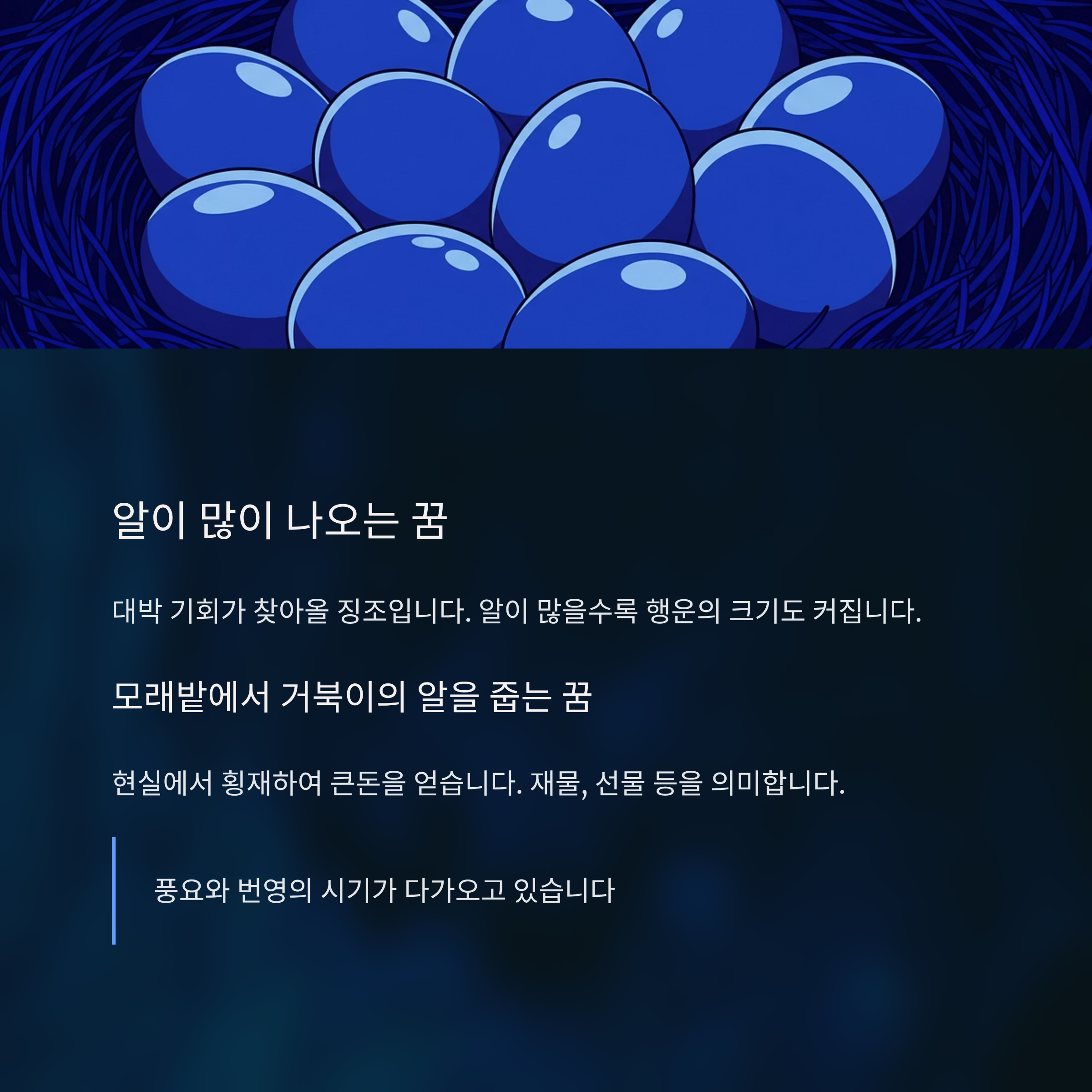 대박 기회가 찾아올 징조입니다. 알이 많을수록 행운의 크기도 커집니다.