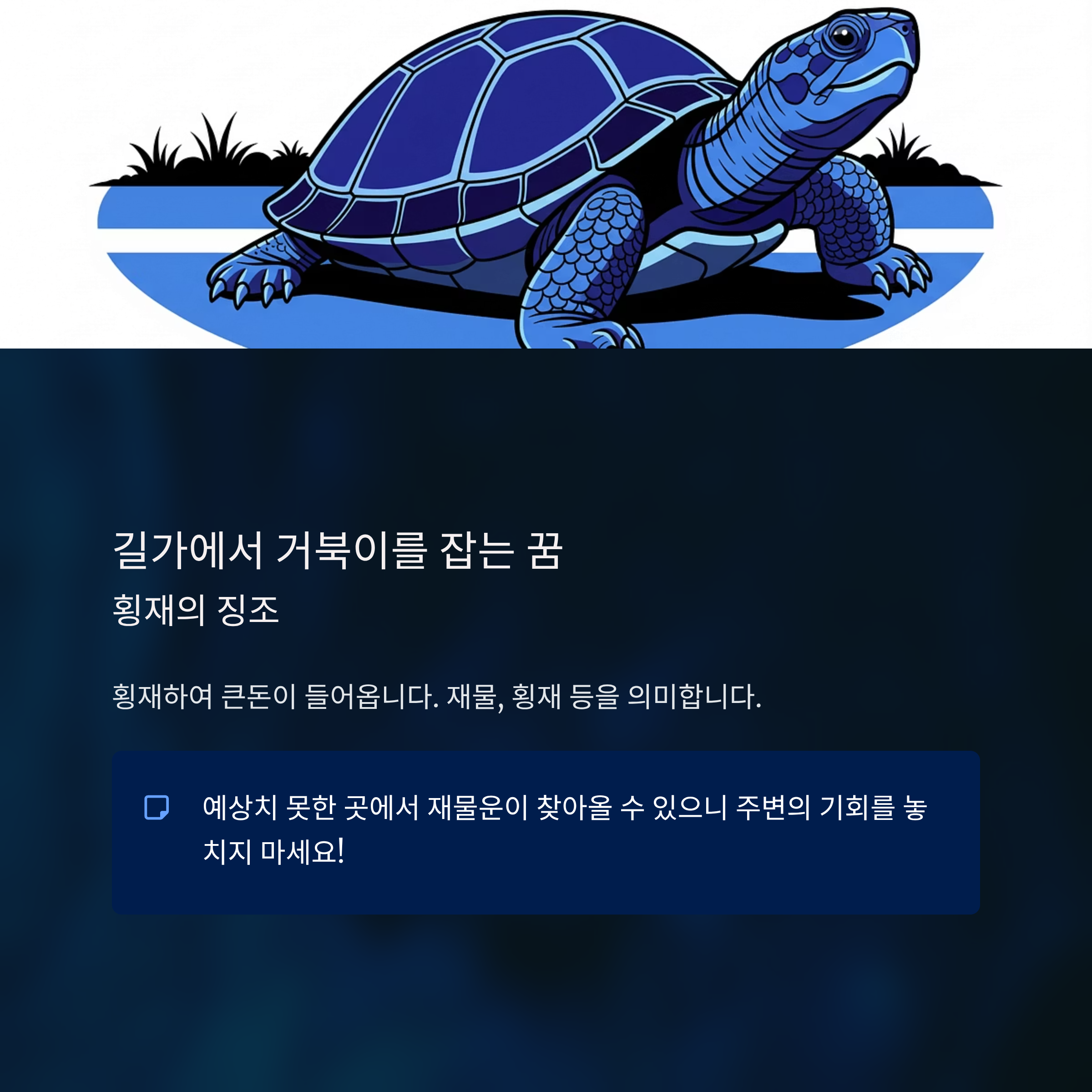 행운과 좋은 소식을 의미합니다. 직장에서 승진하거나, 오랜 목표를 이룰 징조로 볼 수 있습니다. 특히 거북이가 물속에 있는 꿈은 재물운이 상승한다는 의미가 강합니다.
