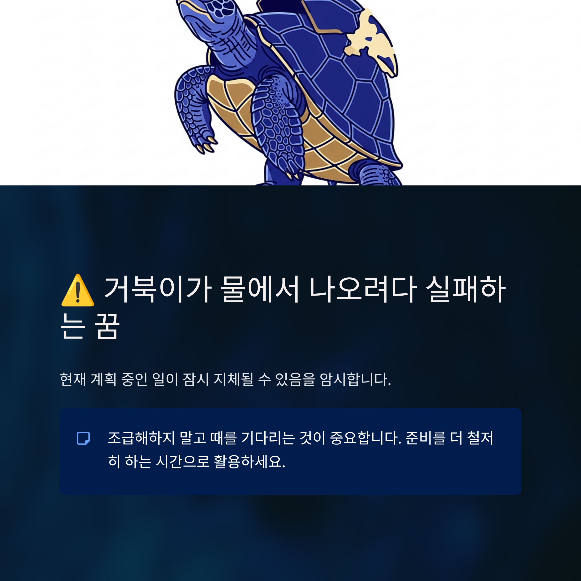 거북이가 물에서 나오려다 실패 → 계획 지체