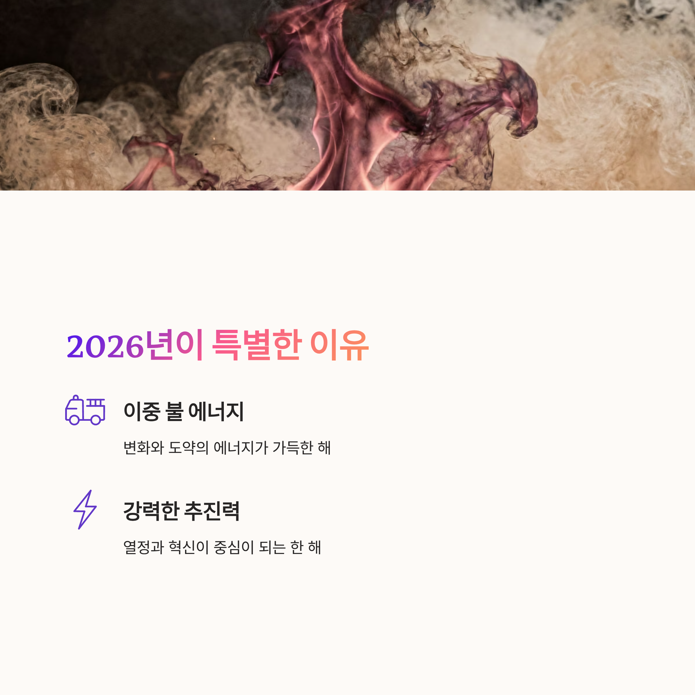 이는 불의 기운이 매우 강한 해라는 뜻입니다. 따라서 2026년은 다음과 같은 특징을 갖습니다: