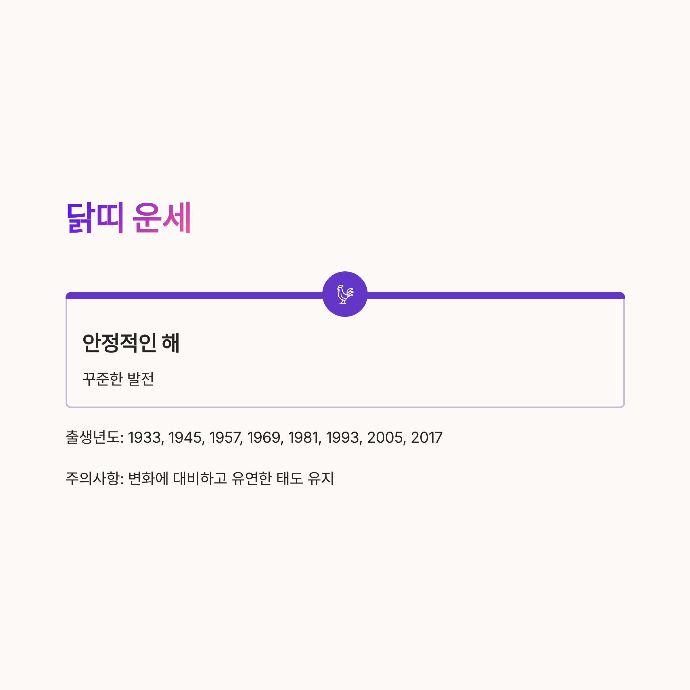 닭띠 (1933, 1945, 1957, 1969, 1981, 1993, 2005, 2017년생):