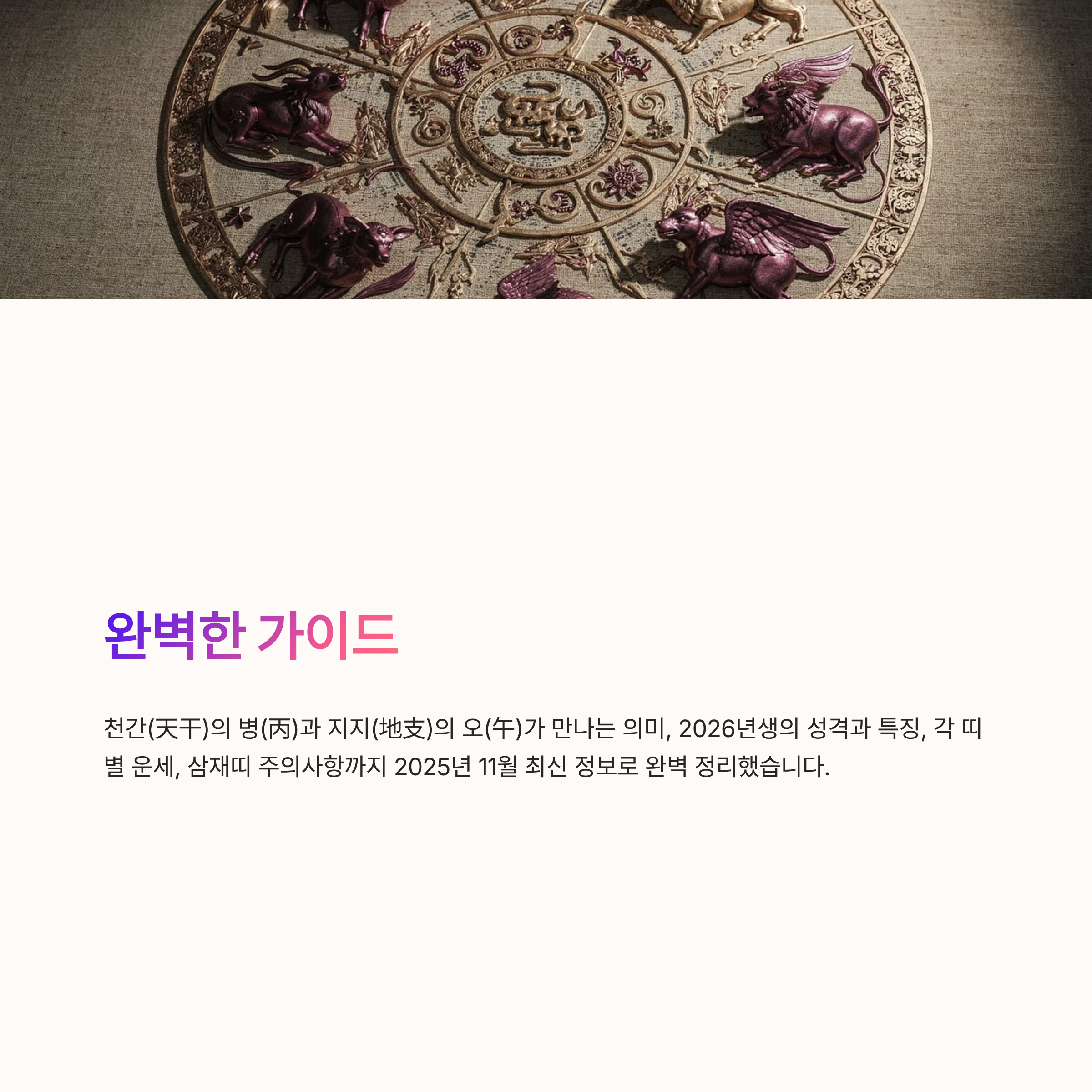 천간(天干)의 병(丙)과 지지(地支)의 오(午)가 만나 어떤 의미를 지니는지, 2026년생의 성격과 특징, 그리고 각 띠별 운세, 특히 삼재띠에 해당하는 사람들이 주의해야 할 점까지 2025년 11월 최신 정보로 완벽하게 정리했습니다.