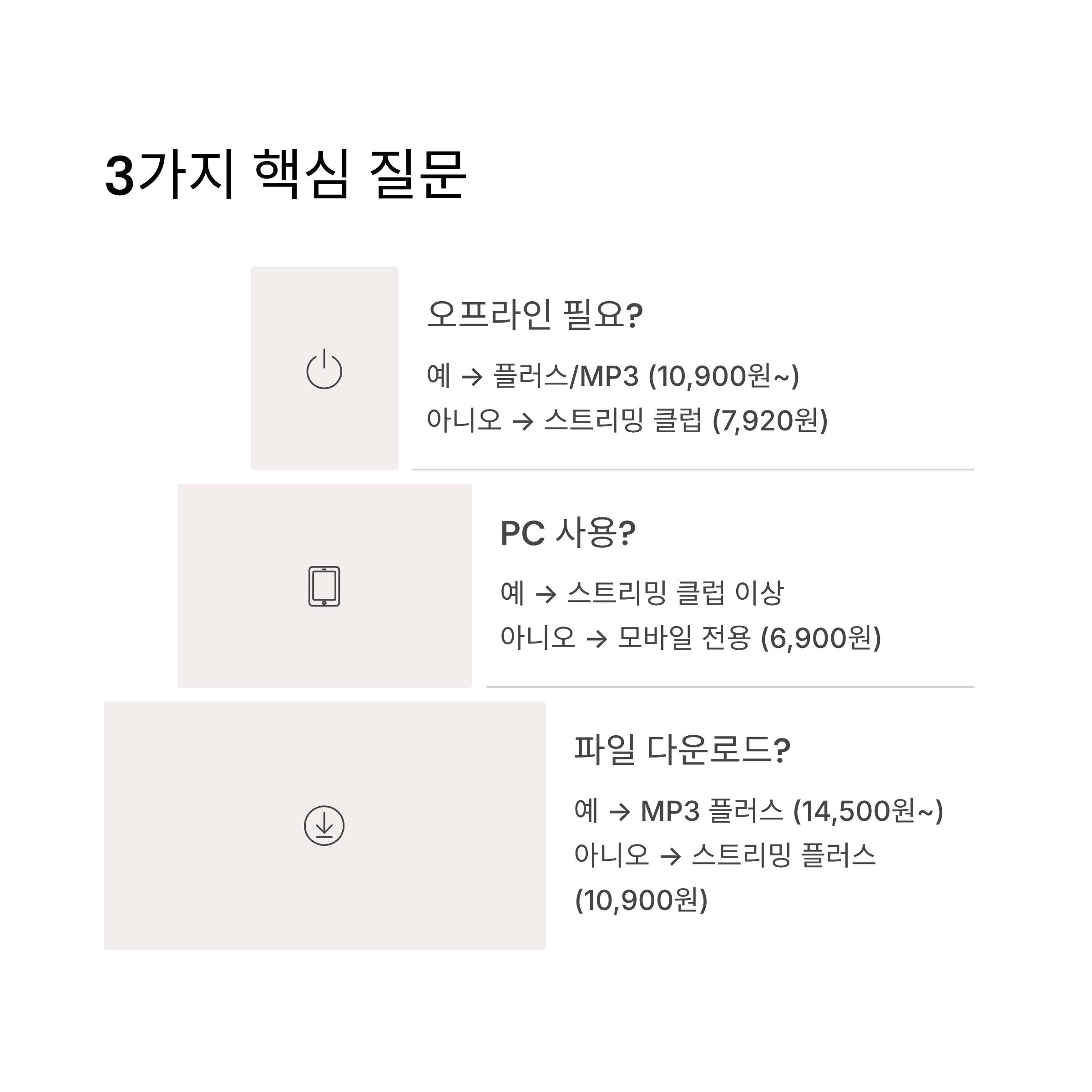 단순히 가격만 비교해서는 안 됩니다. 오프라인 재생이 필요한지, PC에서도 들어야 하는지, 다운로드한 음악을 소장하고 싶은지에 따라 최적의 선택이 달라지기 때문입니다.