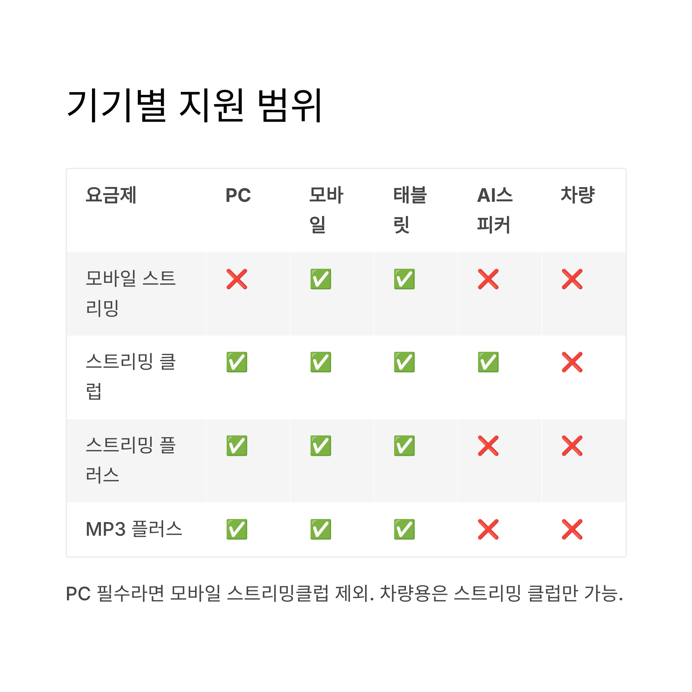 해석: PC에서 들어야 하면 모바일 스트리밍클럽 제외. 차량용으로는 스트리밍 클럽만 가능.