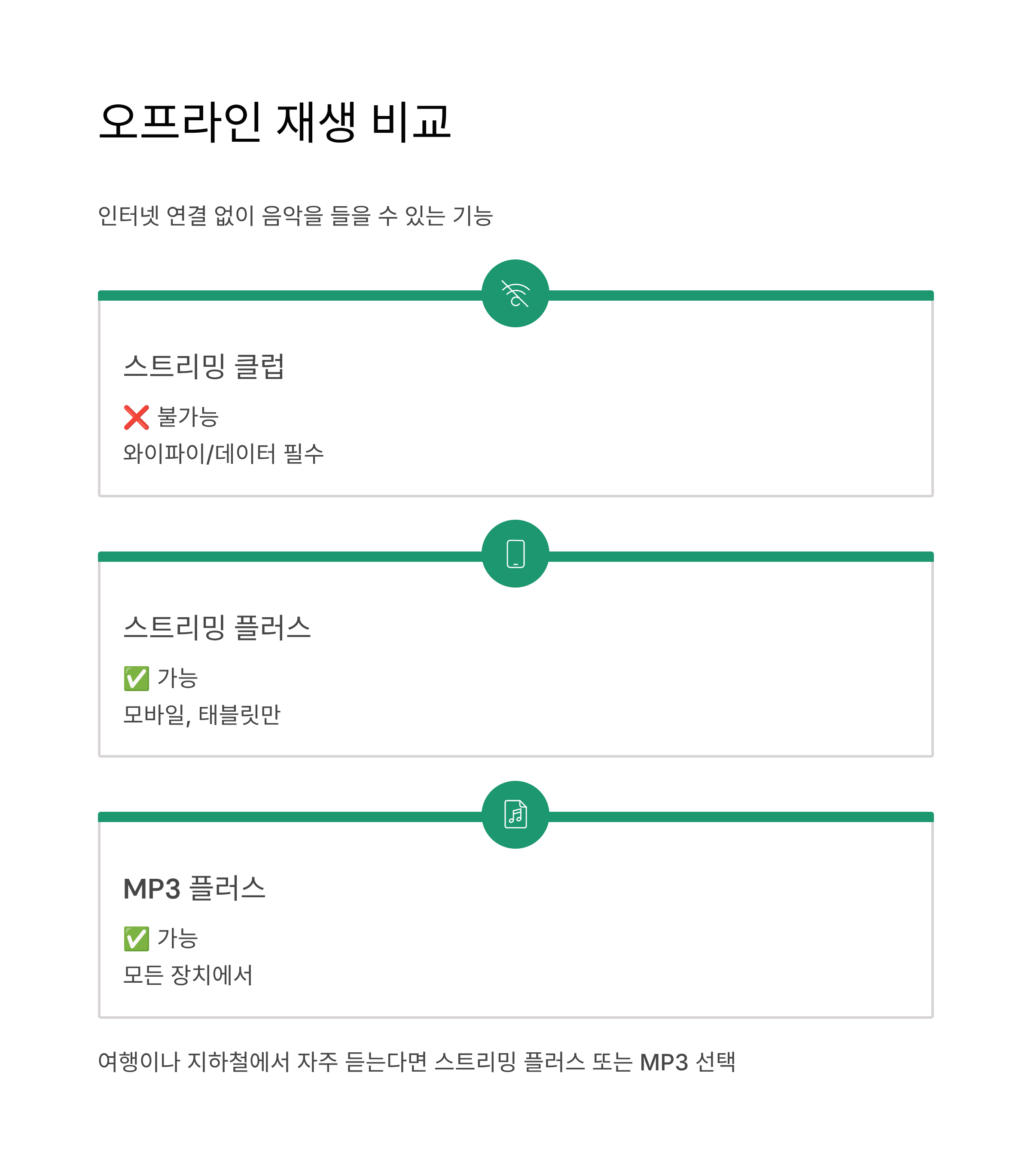 해석: 여행이나 지하철에서 자주 오프라인으로 음악을 들으려면 스트리밍 플러스(모바일만) 또는 MP3(모든 장치) 중 선택.