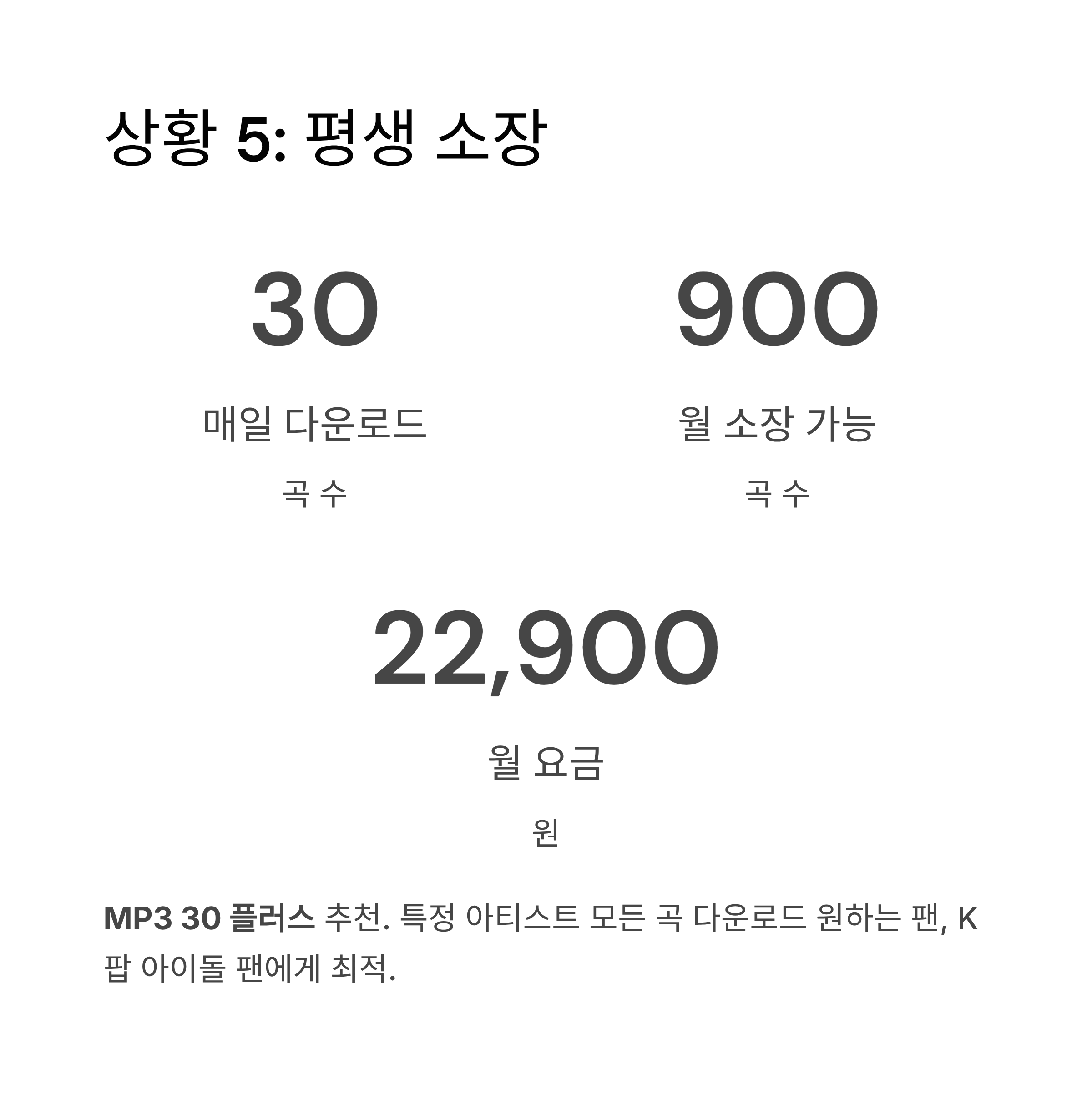 이유: 매일 30곡 MP3 다운로드 가능 → 월 900곡 소장 가능