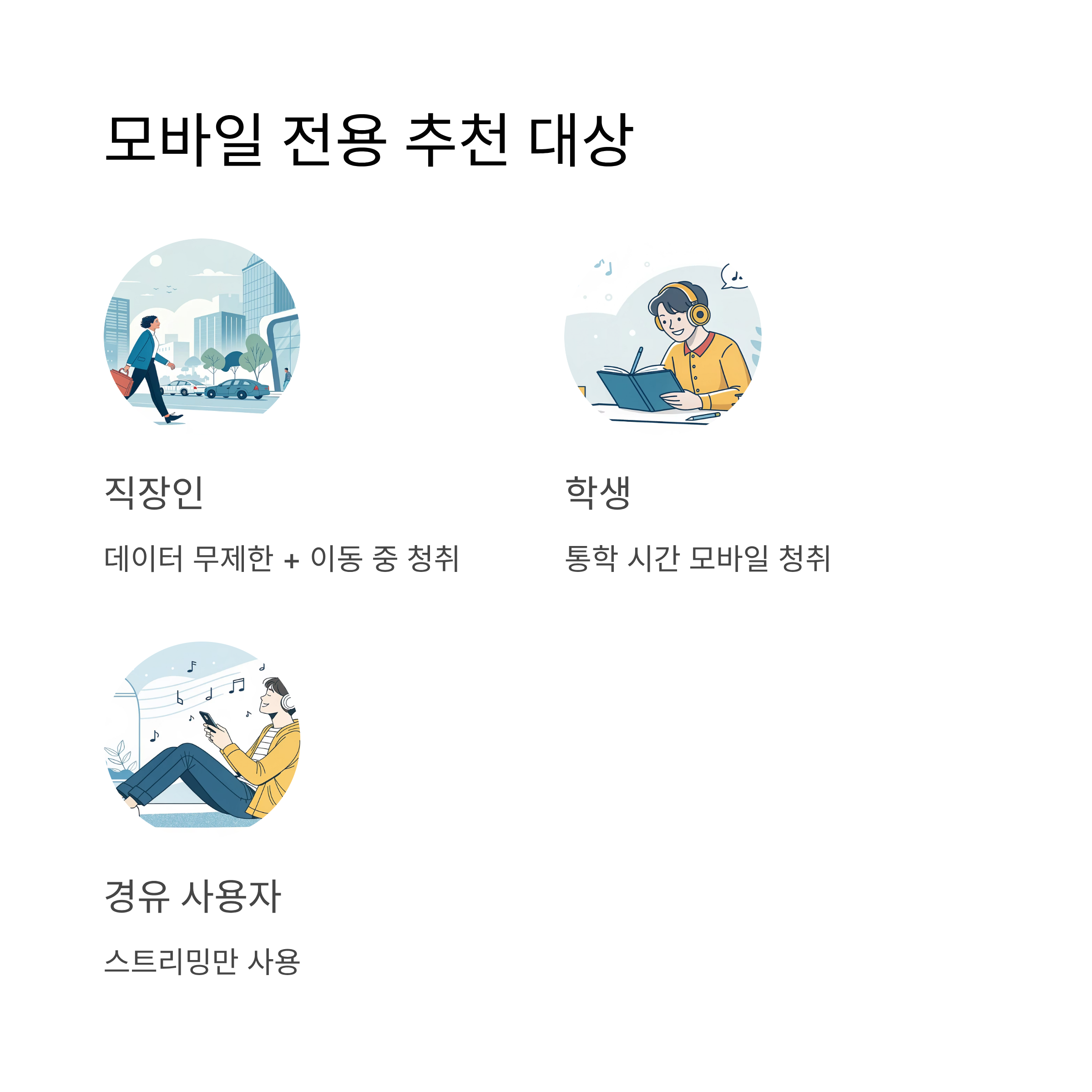 - 직장인 (회사 데이터 무제한 요금제 + 이동 중 모바일 청취)