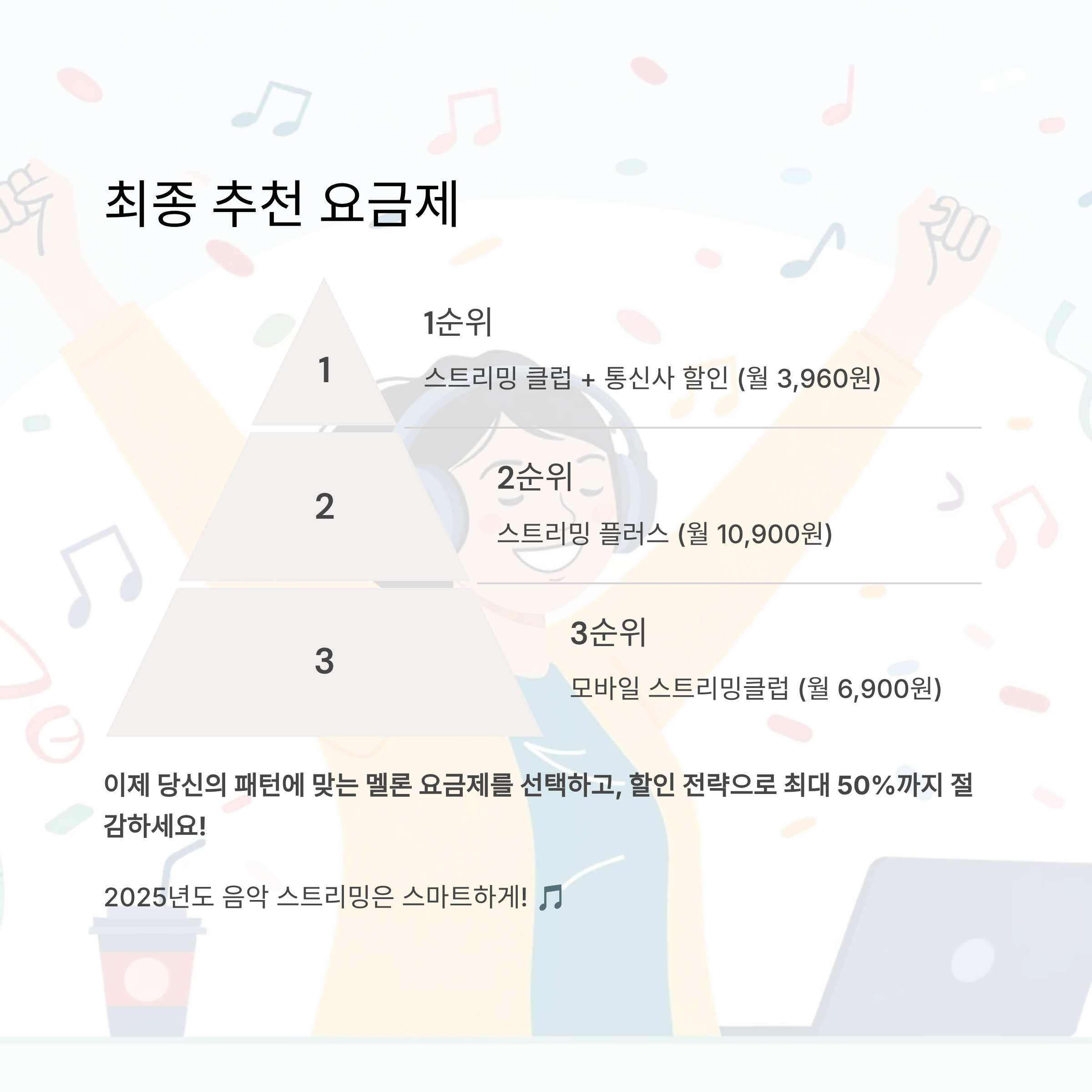 이제 당신의 사용 패턴에 맞는 멜론 요금제를 선택하고, 위의 할인 전략으로 최대 50%까지 절감해보세요. 2025년도 음악 스트리밍은 스마트하게!