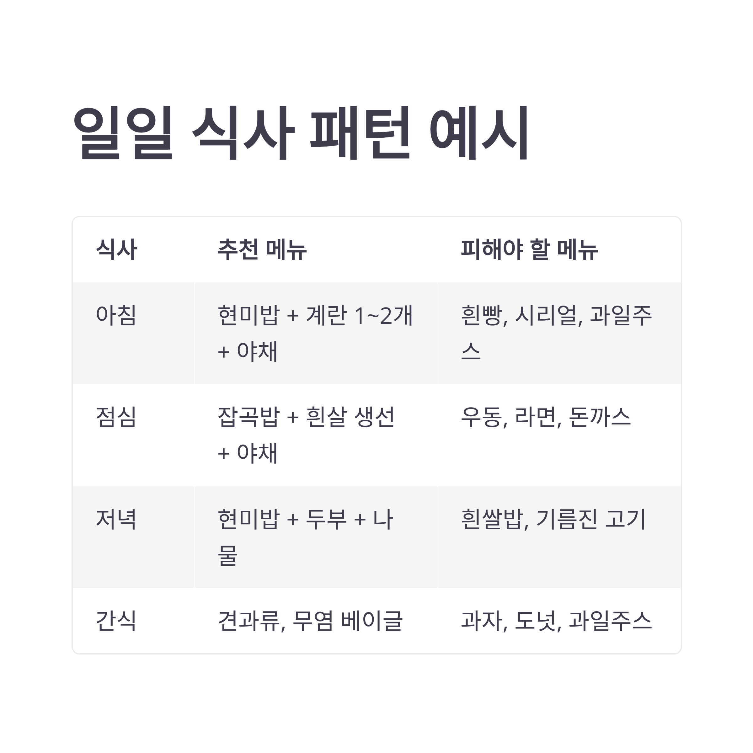 | 아침 | 현미밥 + 계란 1~2개 + 야채 | 흰빵, 시리얼, 과일주스 |