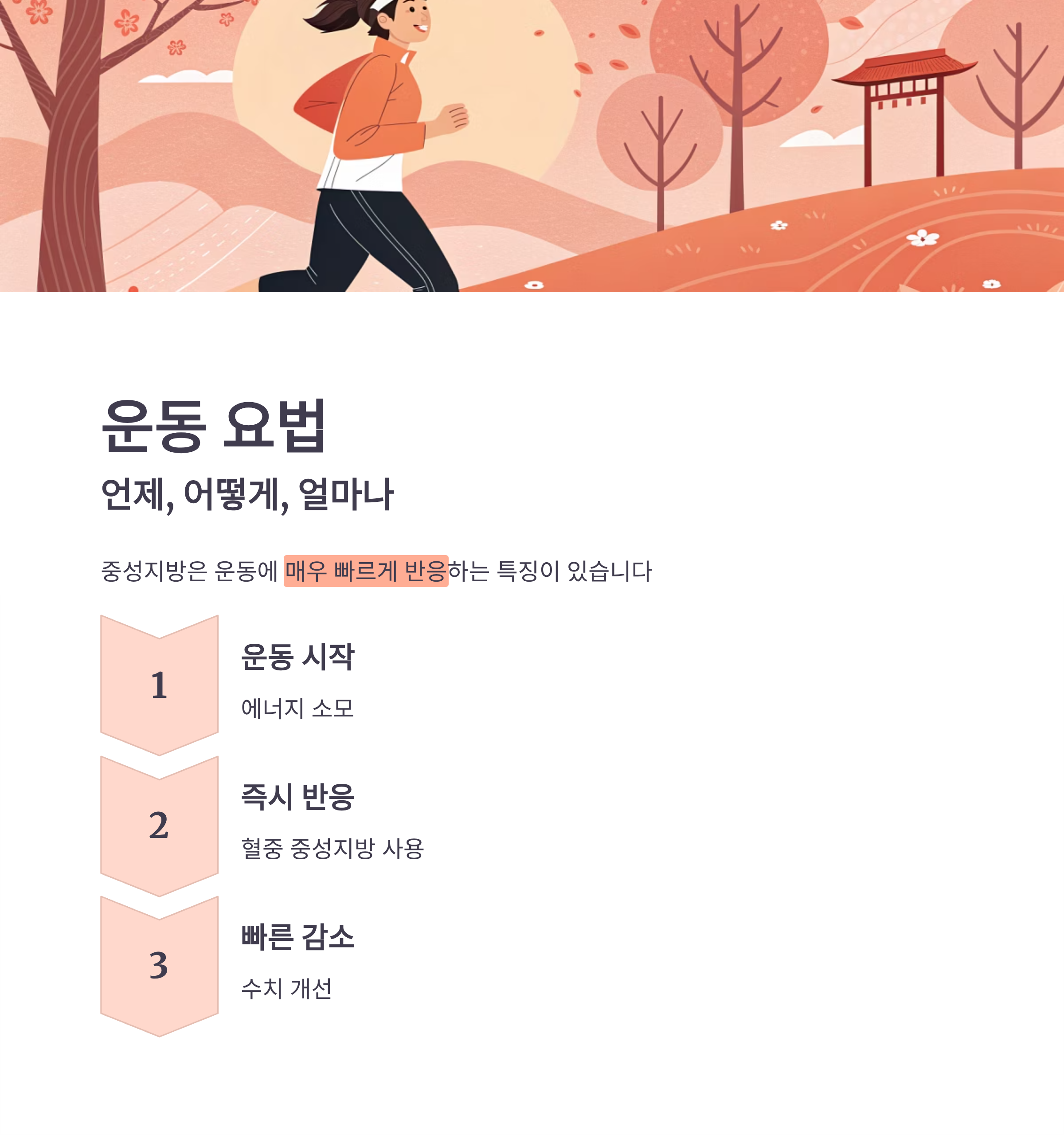 운동으로 에너지를 소모하면 → 즉시 혈중 중성지방을 에너지로 사용 → 저장 중성지방도 동원 → 수치 빠르게 감소