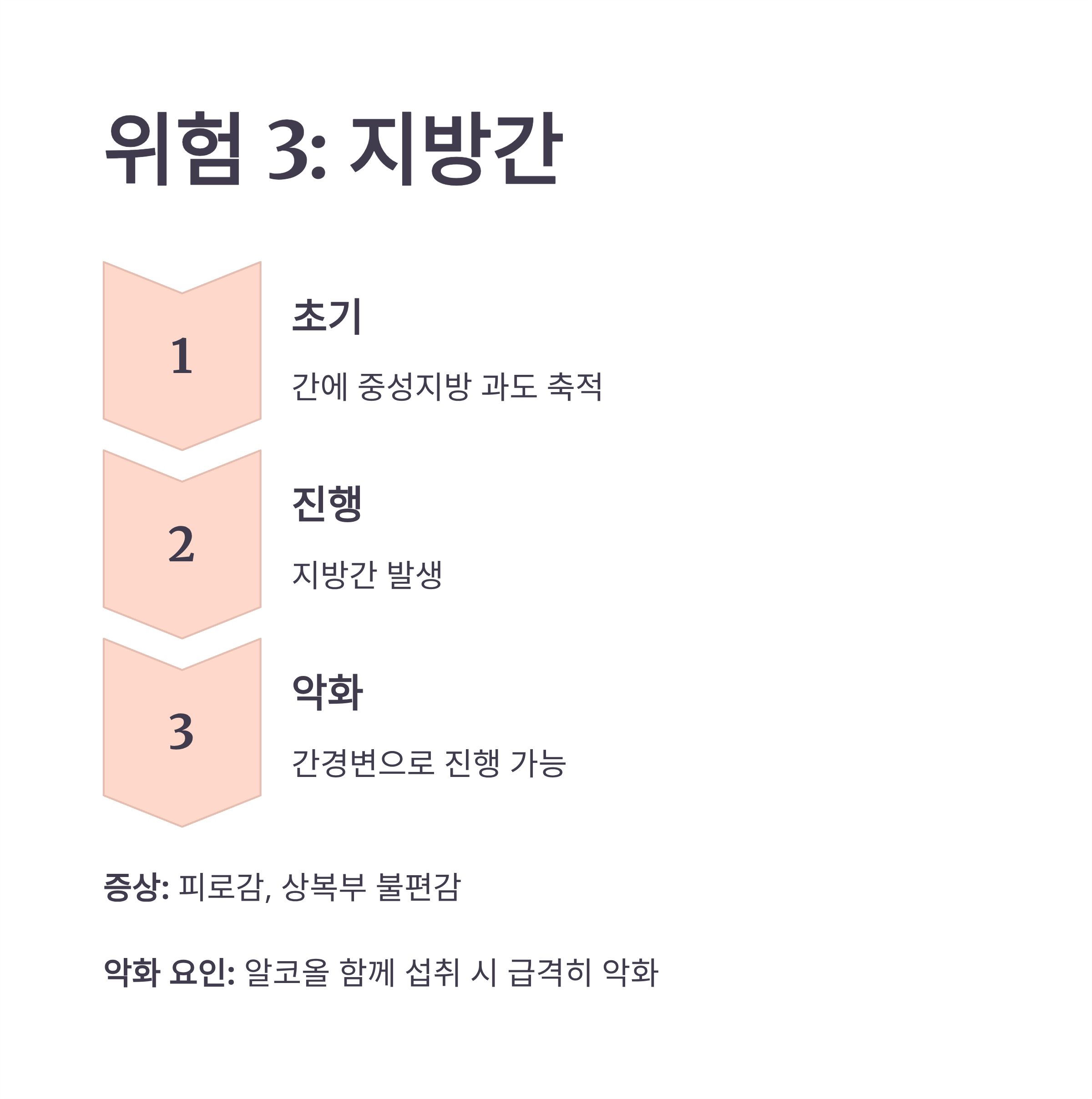 중성지방이 간에 과도하게 축적되면 지방간이 생기고, 심하면 간경변으로 진행할 수 있습니다.