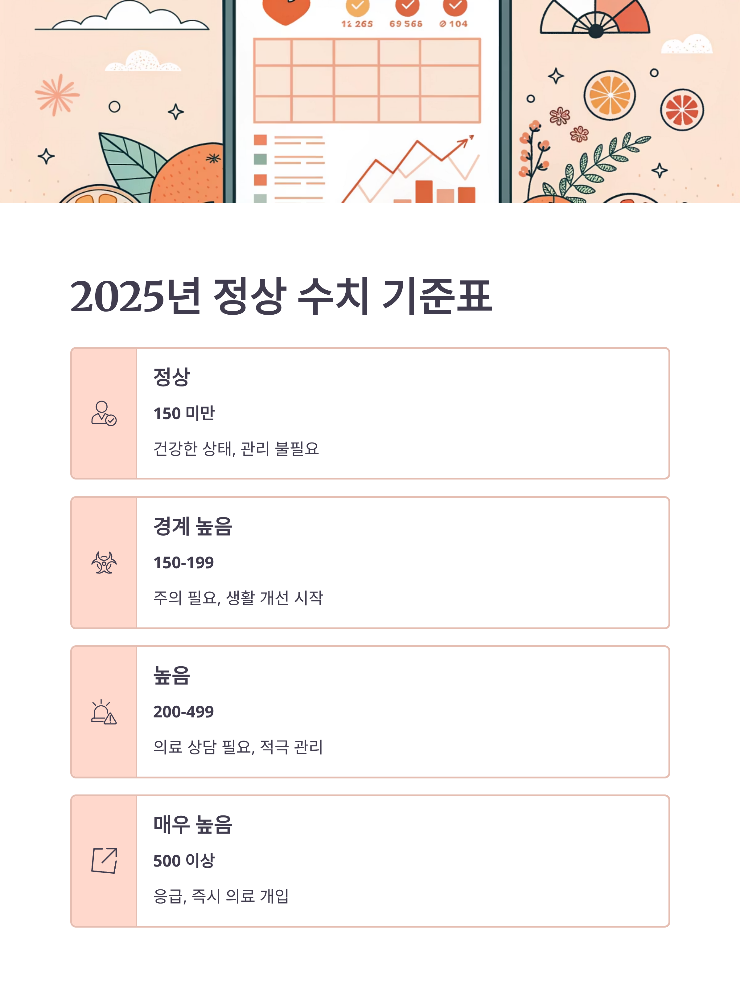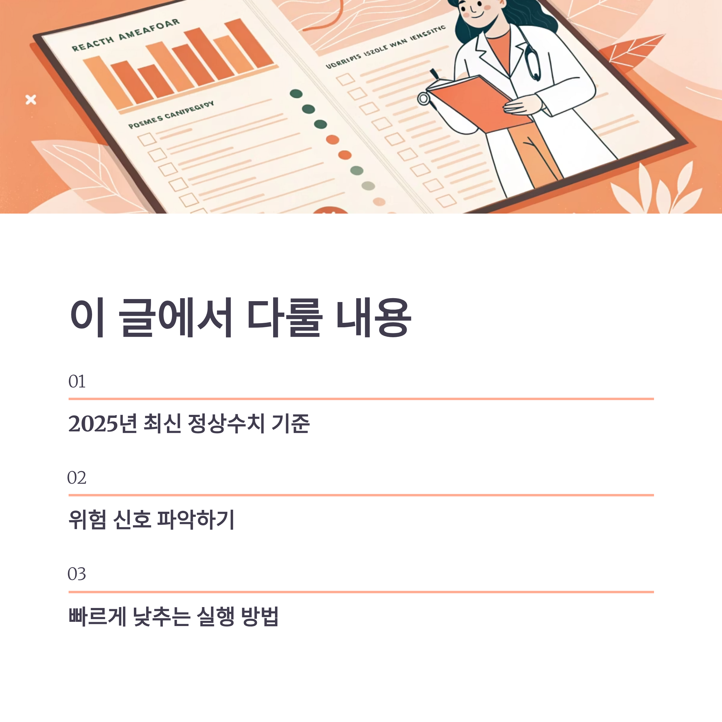 이 글에서는 2025년 최신 의료 기준에 따른 정상수치, 위험 신호, 그리고 빠르게 낮추는 실행 가능한 방법들을 명확하게 정리했습니다.