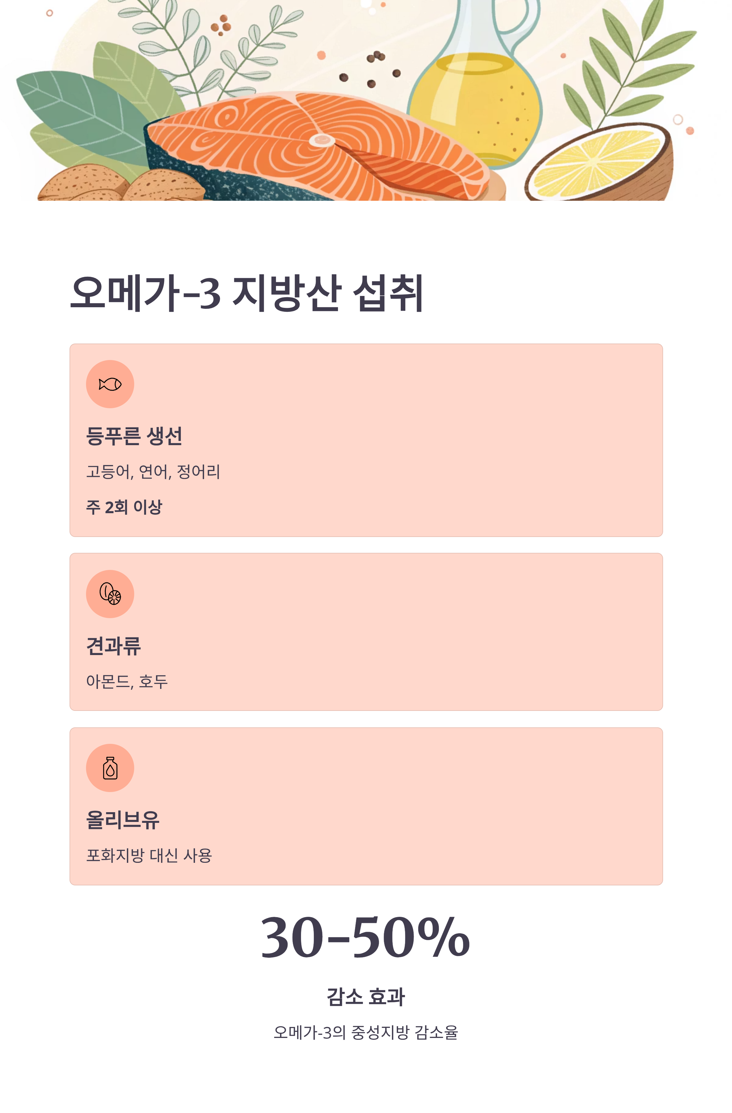 효과: 오메가-3은 중성지방을 직접 낮추는 효과가 있으며, 30~50% 감소 사례도 있습니다.