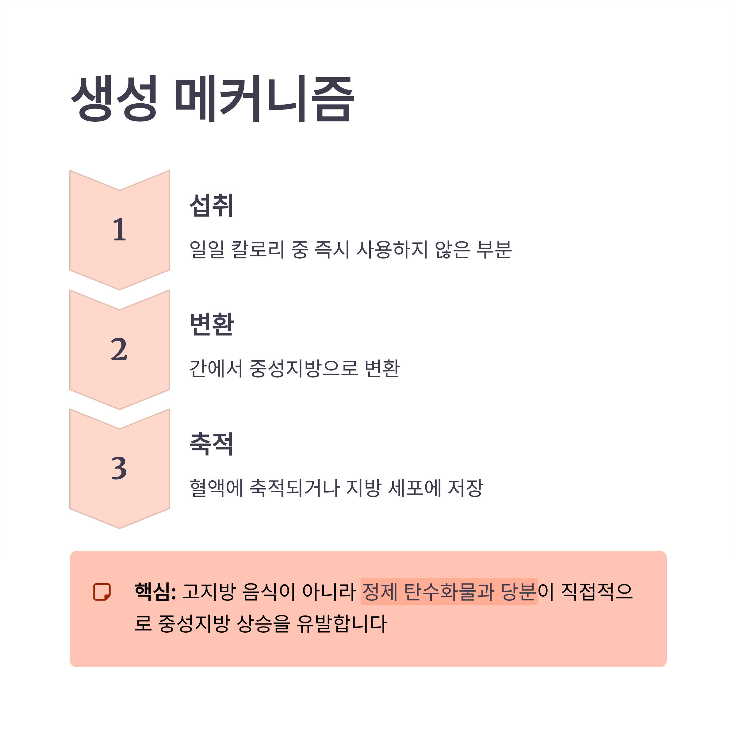 이 메커니즘의 핵심은 탄수화물과 당분입니다. 고지방 음식이 아니라 정제 탄수화물과 당분이 직접적으로 중성지방 상승을 유발합니다.