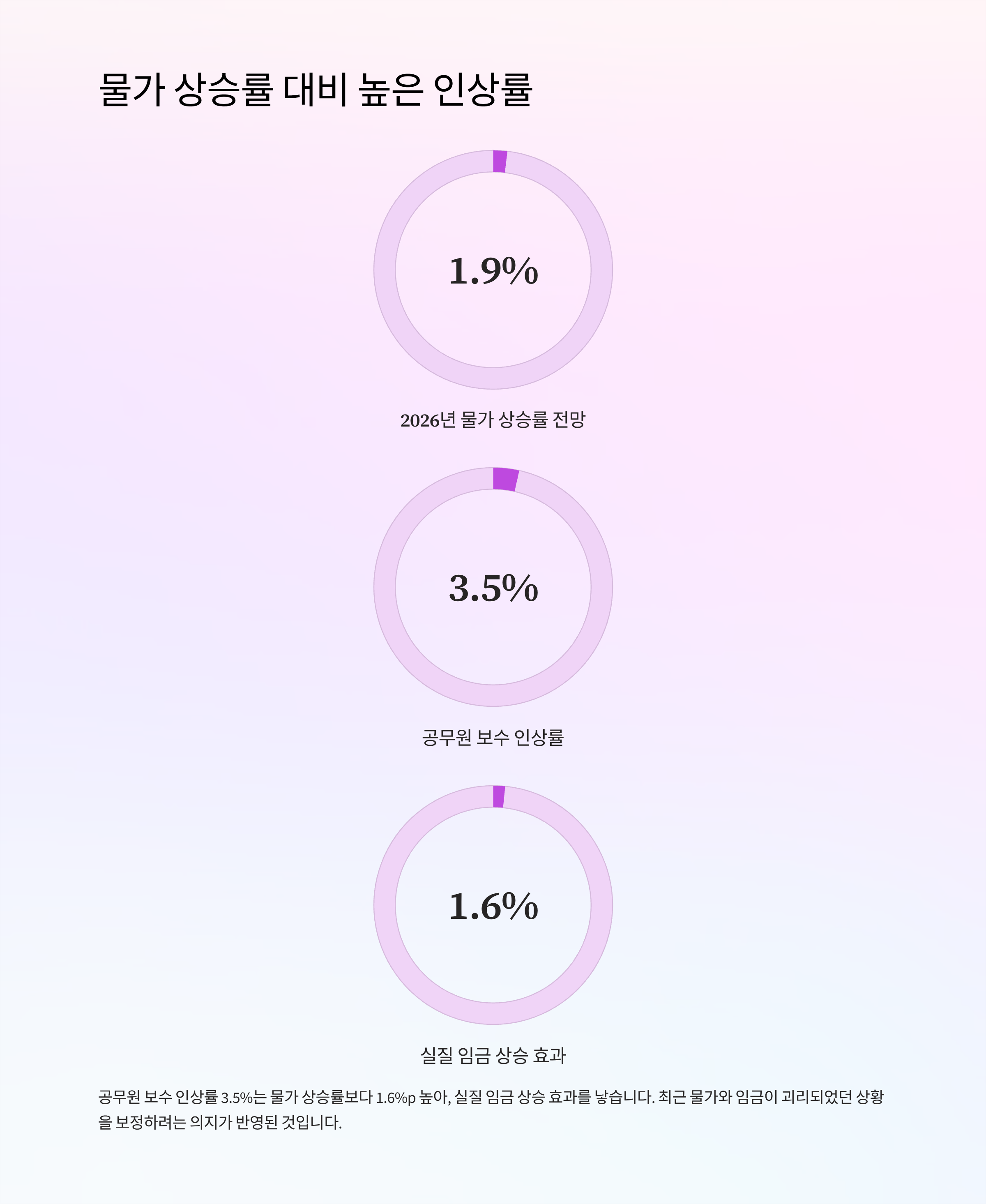 2026년 물가 상승률 전망은 1.9%입니다. 공무원 보수 인상률 3.5%는 물가 상승률보다 1.6%p 높아, 실질 임금 상승 효과를 낳습니다. 최근 물가와 임금이 괴리되었던 상황을 보정하려는 의지가 반영된 것입니다.
