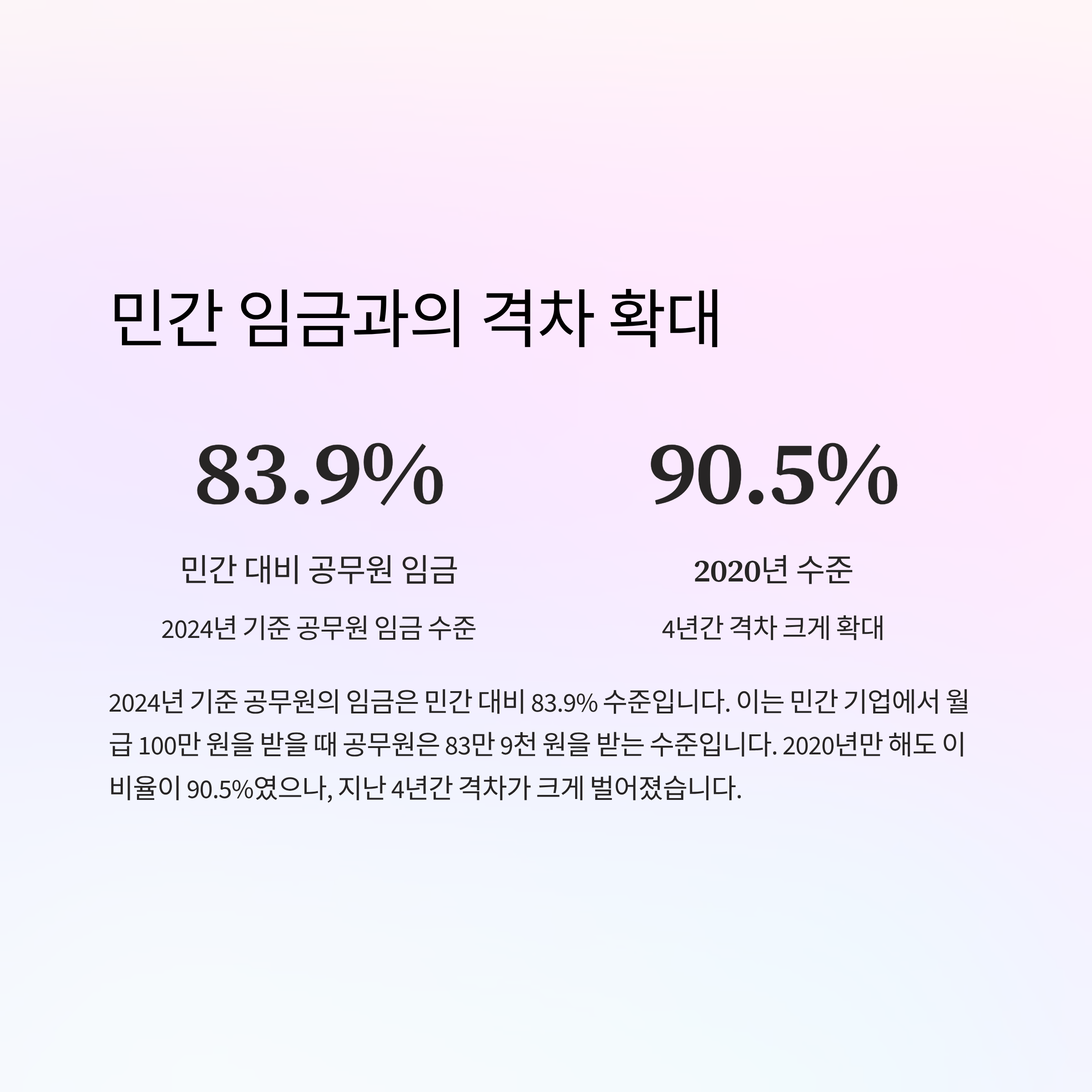 2024년 기준 공무원의 임금은 민간 대비 83.9% 수준입니다. 이는 민간 기업에서 월급 100만 원을 받을 때 공무원은 83만 9천 원을 받는 수준입니다. 2020년만 해도 이 비율이 90.5%였으나, 지난 4년간 격차가 크게 벌어졌습니다. 이는 공직으로의 인력 유출과 채용 매력도 하락을 초래했습니다.